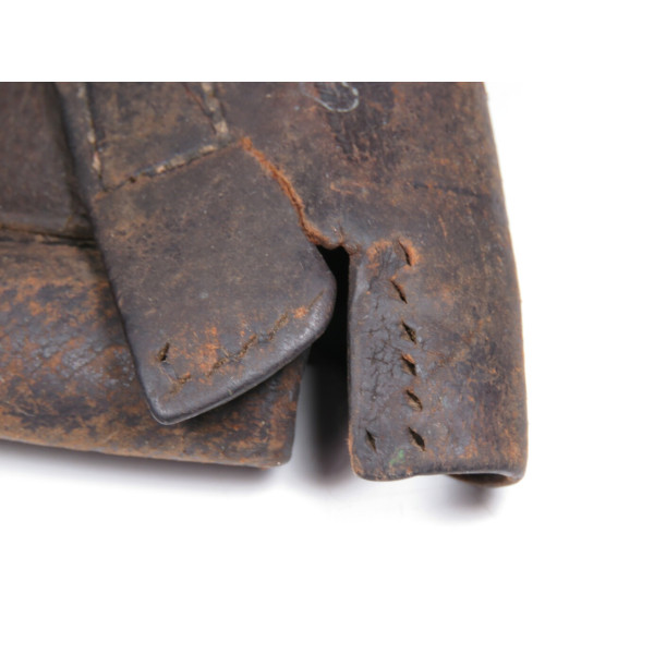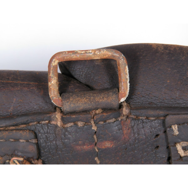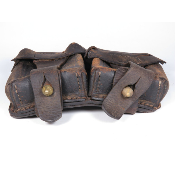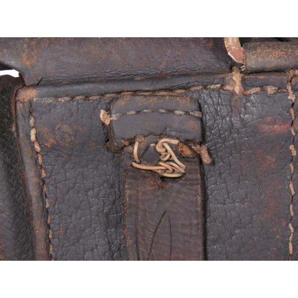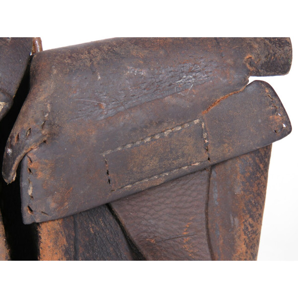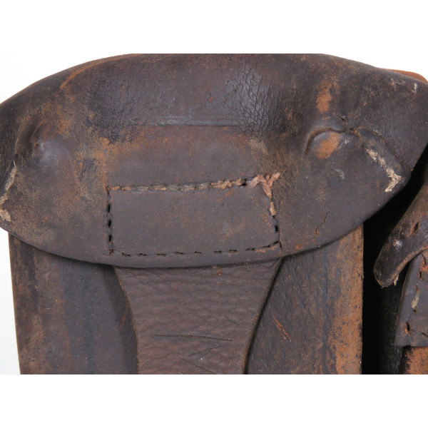 Pre-war 1938 pattern ammo pouch for the Mosin rifle showing heavy field use and wartime repairs, with worn leather components and stitching replaced in field conditions, fair condition as a combat-used item.