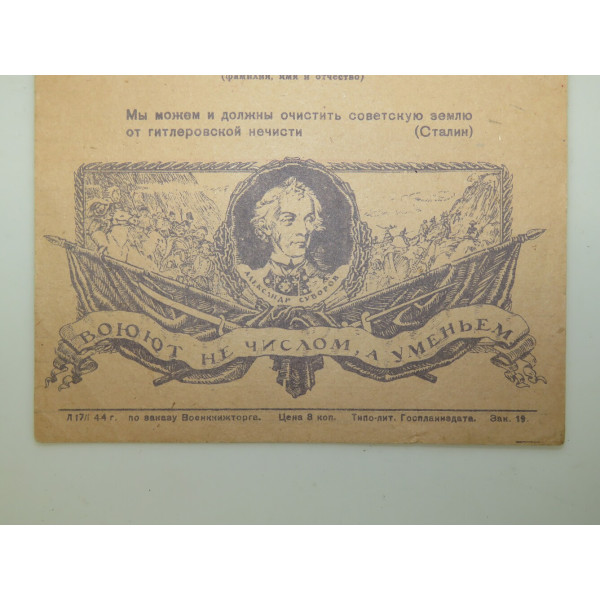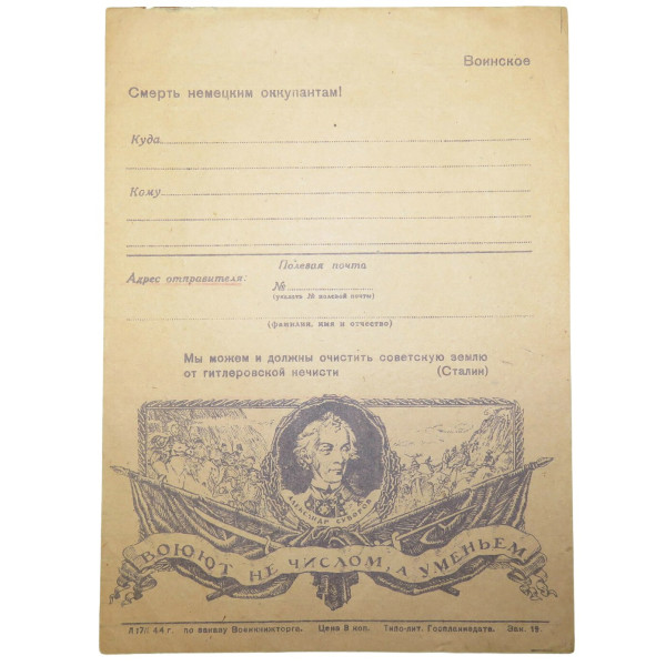 The upper part carries the slogan “Death to the German occupiers!” with “Military” printed on the right below are the lines for filling in the destination and recipient followed by “Sender’s address: Field post No … (indicate field post number) (surname first name and patronymic)” the lower section includes a Stalin quote “We can and must cleanse Soviet soil of Hitlerite filth” beneath the quote is a large illustration featuring a portrait of Alexander Suvorov framed by banners oak leaves and a battle scene the lower ribbon reads “They fight not by number but by skill” the bottom left indicates “L 7/11 44 g. ordered by the Military Cinema Trust” the price marked as “8 kopeks” and “Typo-lit. Gosplanizdat. Order 19.” the print run is not specified on the sheet
