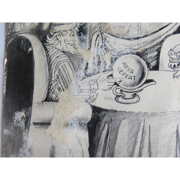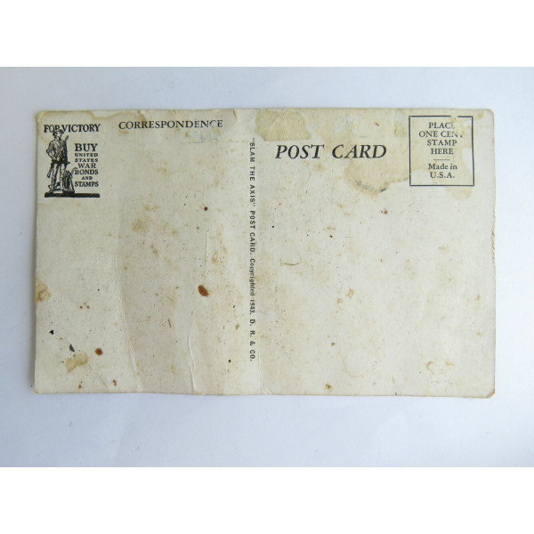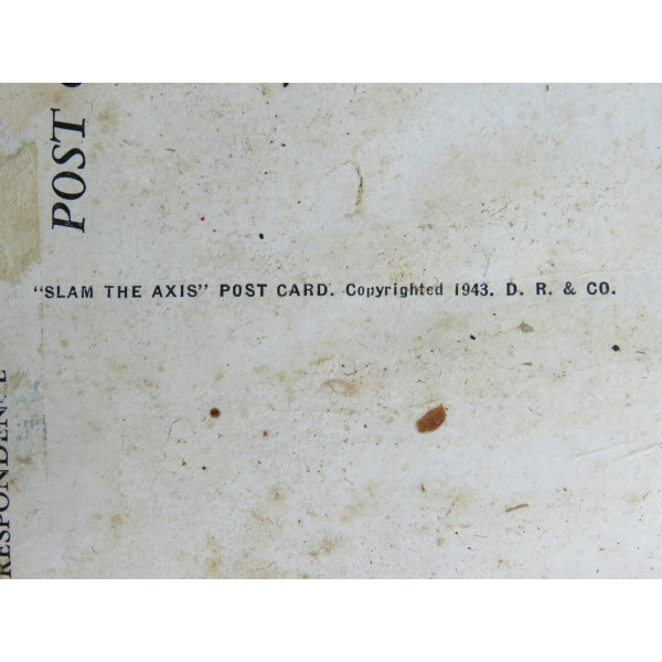 The card shows visible signs of age — wear, stains, and tears. A vivid example of anti-Hitler and anti-Axis propaganda from World War II.