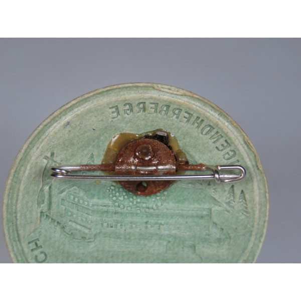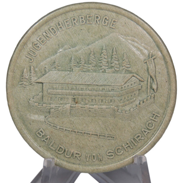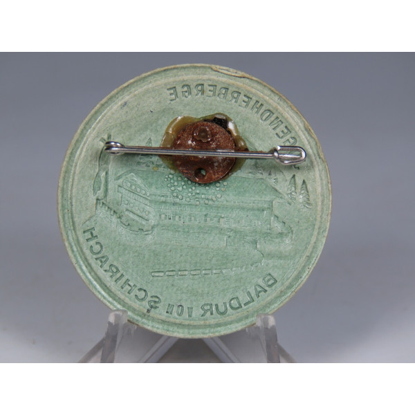 Cardboard badge dedicated to the youth hostel named after Baldur von Schirach. The front depicts the alpine-style hostel building with mountains and coniferous trees in the background, surrounded by the inscription “Jugendherberge Baldur von Schirach.” Made of pressed cardboard. Good condition with minor traces of age.