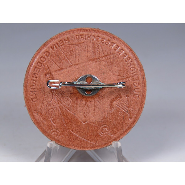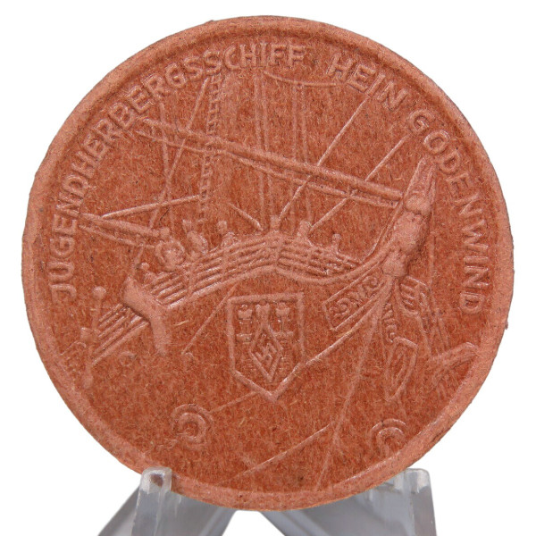 Cardboard badge dedicated to the youth hostel ship Hein Godenwind, based in Lübeck. Made of pressed red cardboard. The front shows a sailing ship with flags and the inscription around the edge “Jugendherbergsschiff Hein Godenwind.” Well-preserved example with light traces of age.