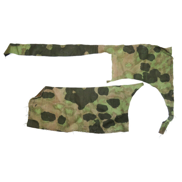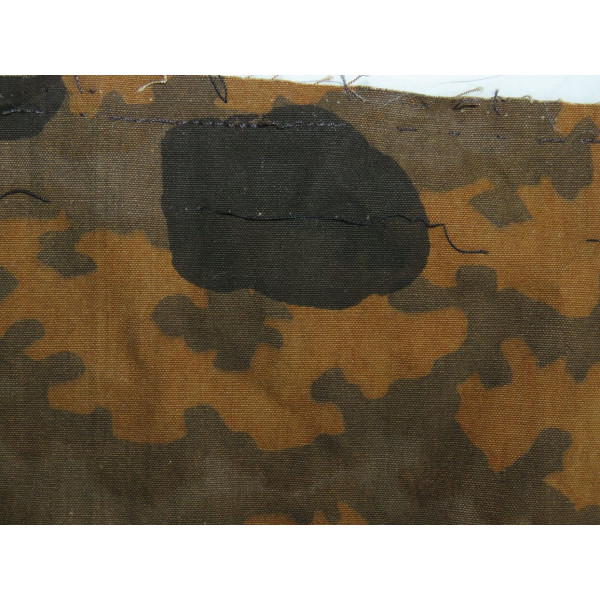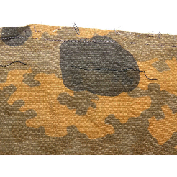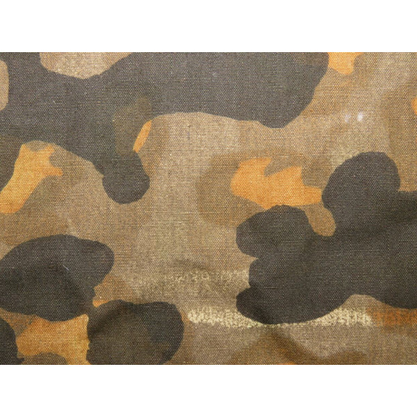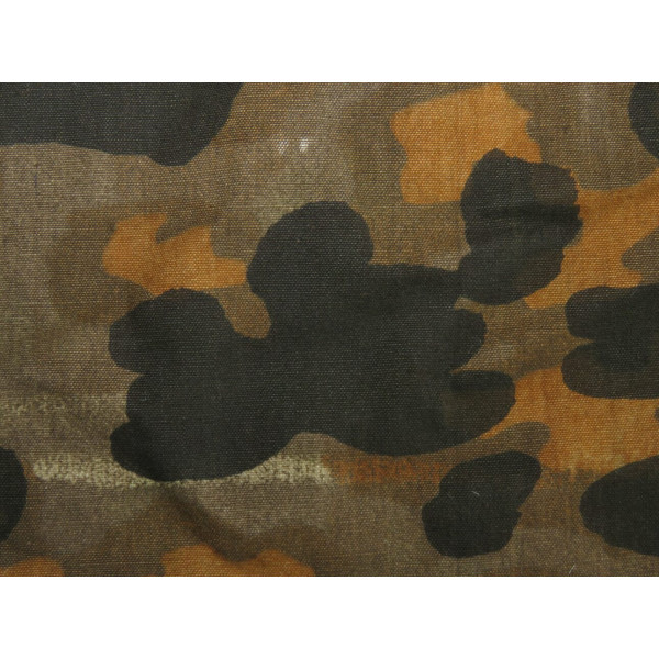 Fragment of Waffen-SS camouflage fabric produced with the Overprint technique. The base pattern is Eichenlaubmuster (Oak Leaf), overprinted with Platanenmuster (Plane Tree), creating a distinctive layered effect. Such combinations were used in the manufacture of Waffen-SS uniforms and camouflage shelter quarters during the war. A fine example of a rare camouflage variant preserved in authentic condition.
