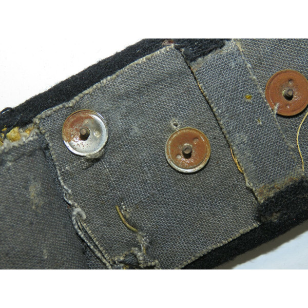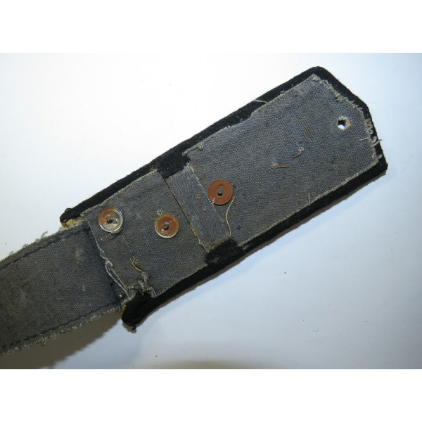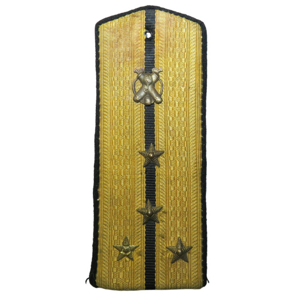 Captain RKKA chemical troops shoulder board with black cloth backing and yellow silk braid with a single black stripe, featuring the early 1935 pattern chemical troops emblem. Chemical troops at the front were primarily flame-thrower and smoke-screen units, deploying smoke cover and operating within nearly all assault formations. Good condition.