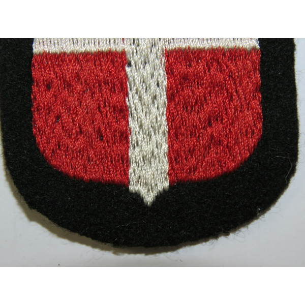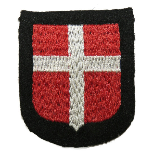 Danish Waffen-SS volunteer sleeve shield, SS-Freiwilligen-Regiment 24 Danmark. Machine embroidered on black wool cloth. Mint condition, no signs of use.