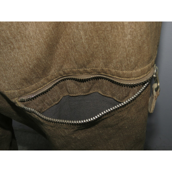 Der Anzug weist klar definierte technische Konstruktionsdetails auf, die für die Fertigungsstandards des Dritten Reiches charakteristisch sind, und stellt ein hochwertiges Beispiel der frühen Kriegsproduktion dar. Er verfügt über Oberschenkeltaschen mit Reißverschluss, verstellbare Manschetten und ein praktisches, für den Einsatz konzipiertes Zugangssystem.