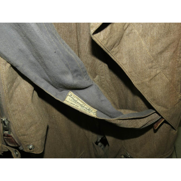 Fluganzug der Luftwaffe aus dem Jahr 1941, hergestellt von der Bekleidungsfabrik Habelt, Carlsheim, Württemberg, wie das originale Innenetikett mit der Bezeichnung Baujahr 1941 und Größe 1a bestätigt. Der Anzug ist aus Baumwollstoff in grünmelierter Webart gefertigt, charakteristisch für die frühe Kriegszeit und die Anfangsphase der Operation Barbarossa.