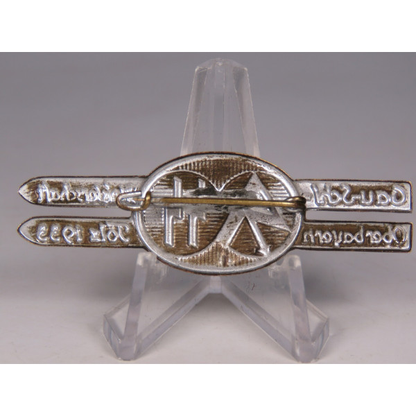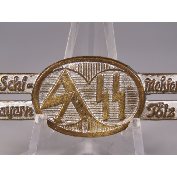 Abzeichen der Gau-Ski-Meisterschaft, Oberbayern, Tölz, 1933. Beschriftet Gau-Schi-Meisterschaft Oberbayern Tölz 1933. In der Mitte die Embleme der SA und SS. Messing mit Versilberung. Zustand mit natürlichen altersbedingten Gebrauchsspuren.