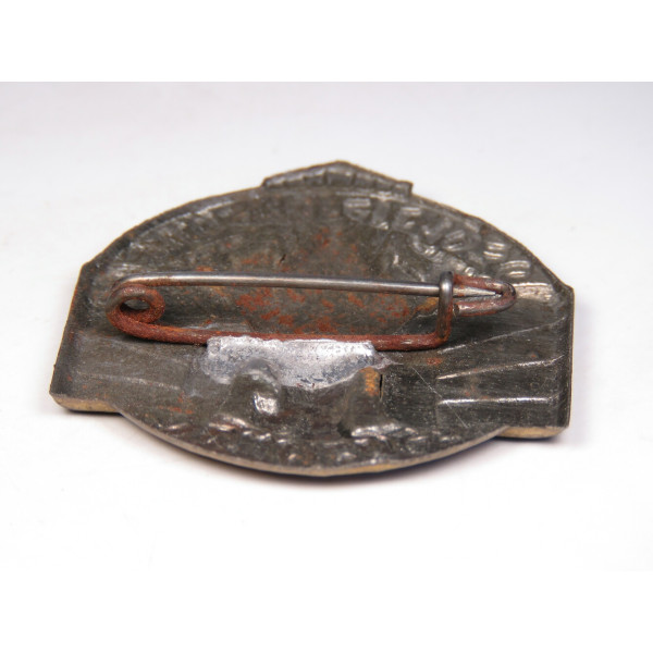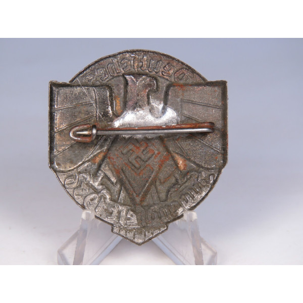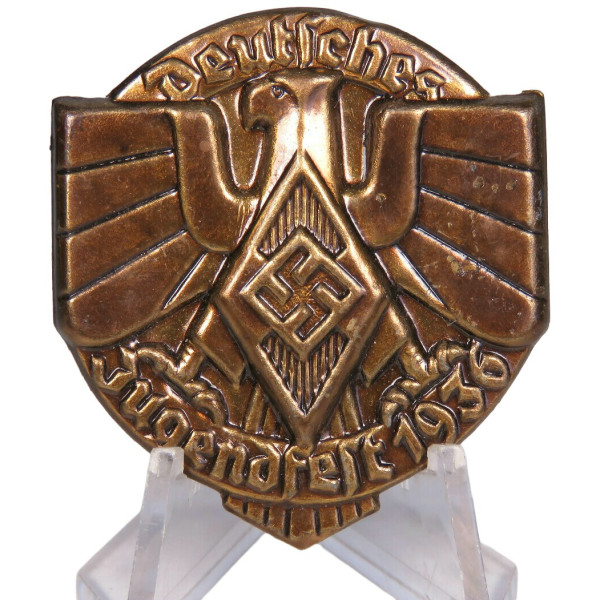 Participant badge for the German National Youth Festival of 1936. The obverse features a national eagle with the Hitler Youth diamond and swastika at the center, inscription below: “Deutsches Jugendfest 1936”. Stamped from tinplate with bronze finish and toned highlights, lightly patinated surface. Good collectible condition.