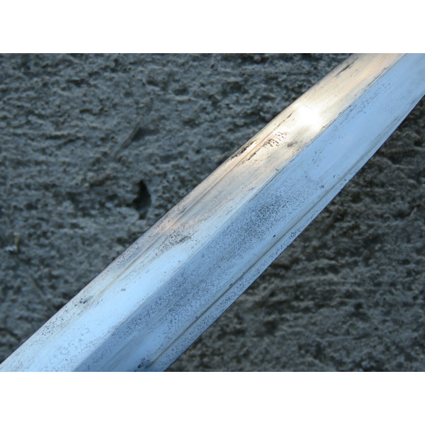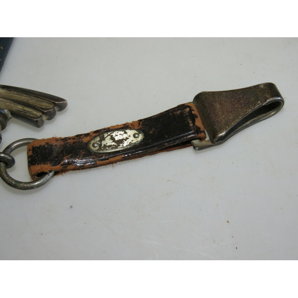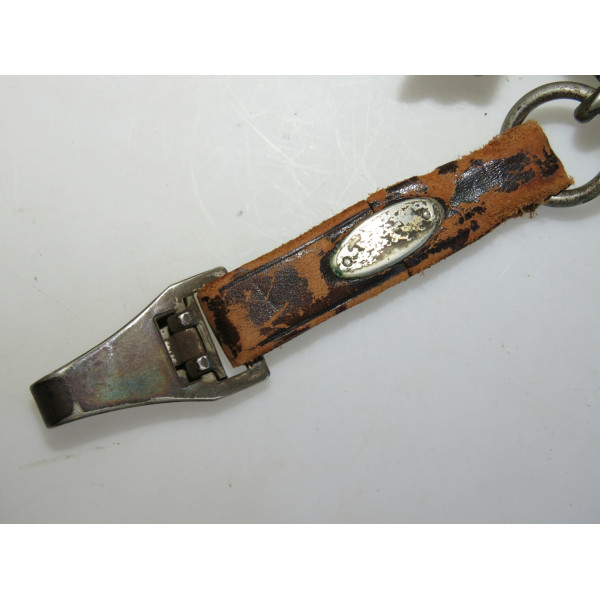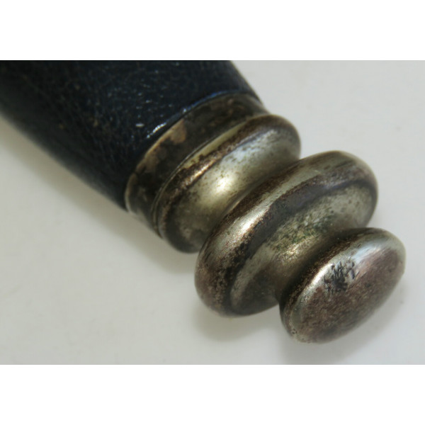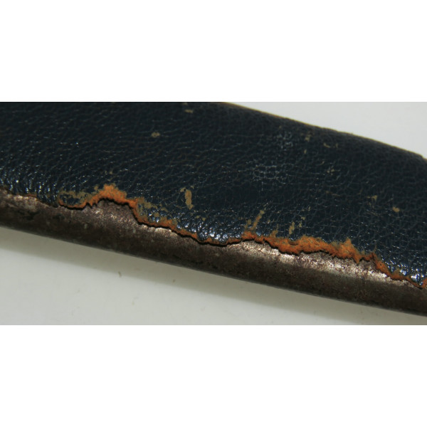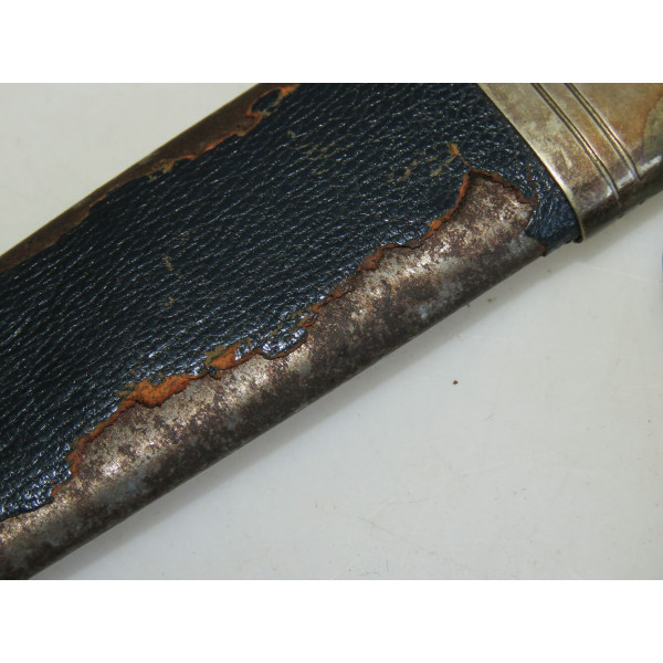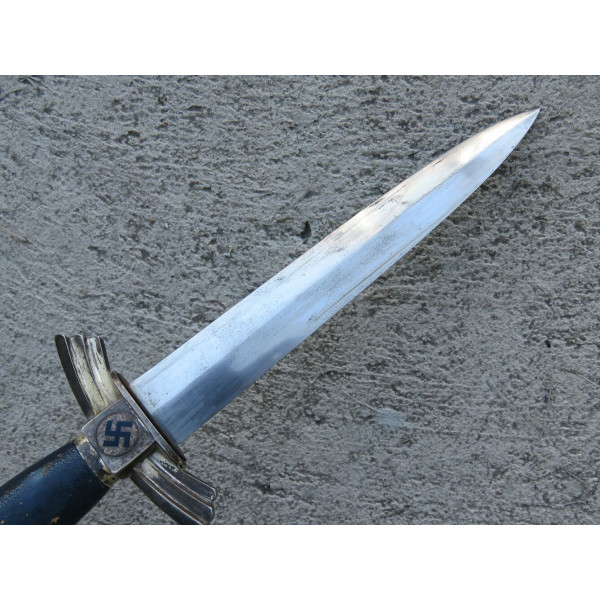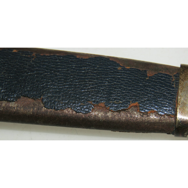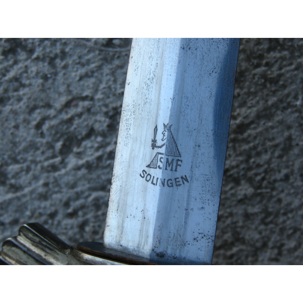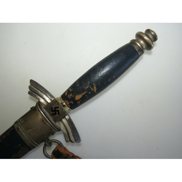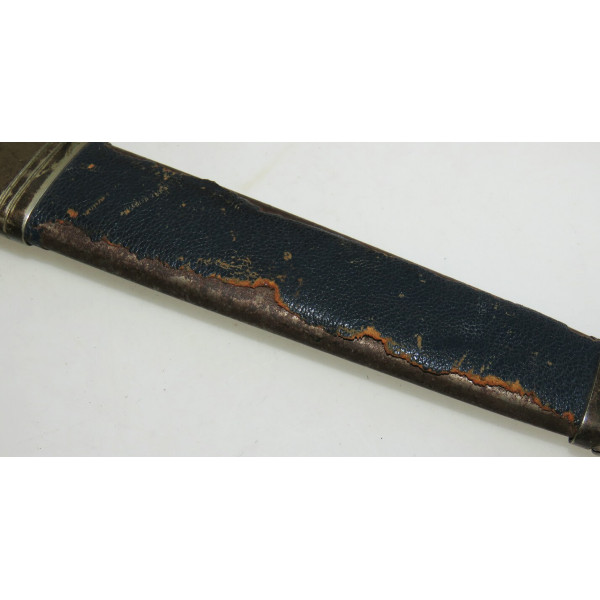 Solingen Deutscher Luftsportverband Fliegermesser by SMF — Solinger Metallwaren-Fabrik Stöcker & Co., Solingen, the blade bears an etched maker mark with the elector holding a sword logo. The blade remains in good condition with typical signs of use. The handle has a metal base covered in bluish leather showing wear and damage. The crossguard is formed as stylized wings. The scabbard is steel covered with leather, with partial loss of the leather covering. The metal fittings of the scabbard, including the tip and throat with suspension ring, are made of nickel silver. The leather hanger also shows wear from use