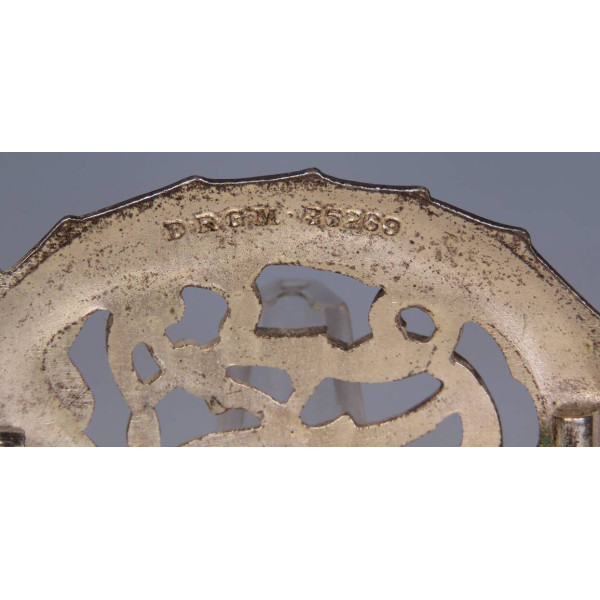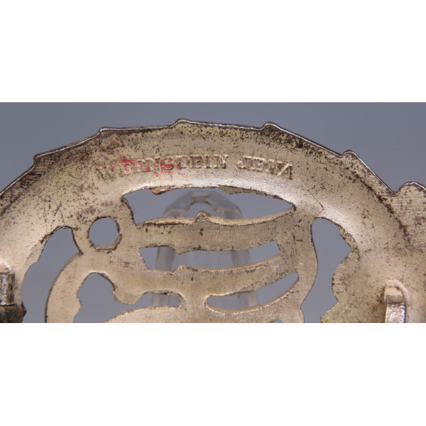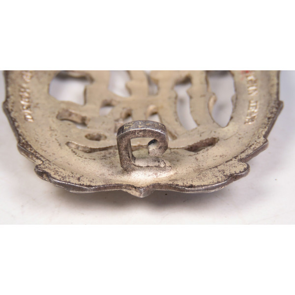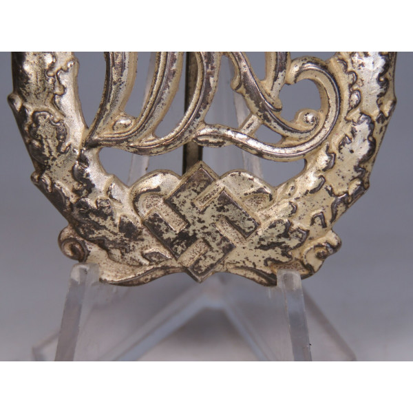 DRL (Deutsches Reichssportabzeichen) sports badge in silver. Made of silver-plated buntmetal, marked on the reverse by the manufacturer "Wernstein Jena DRGM 35269". Excellent condition with fully preserved silver finish and slight patina on raised areas. A superb collectible piece.