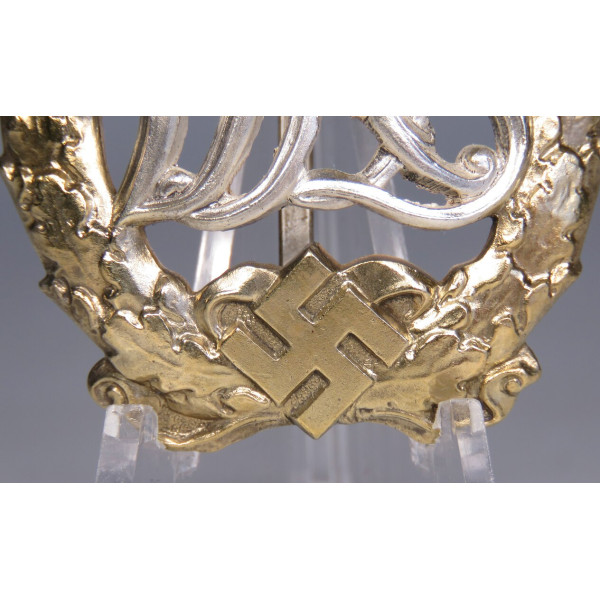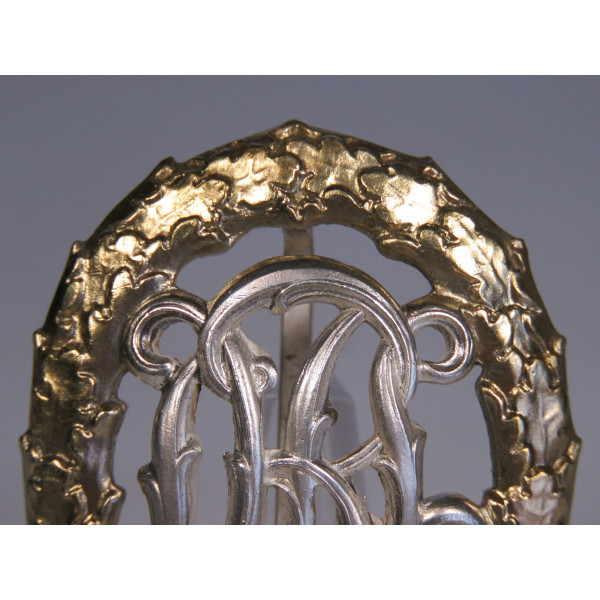 Original Deutscher Reichsbund für Leibesübungen (DRL) sports badge for war-disabled veterans, silver grade. The wreath is made of buntmetall with applied gilding, and the "DRL" monogram is silvered. The reverse is marked with Wernstein Jena and the patent number D.R.G.M. 35269.