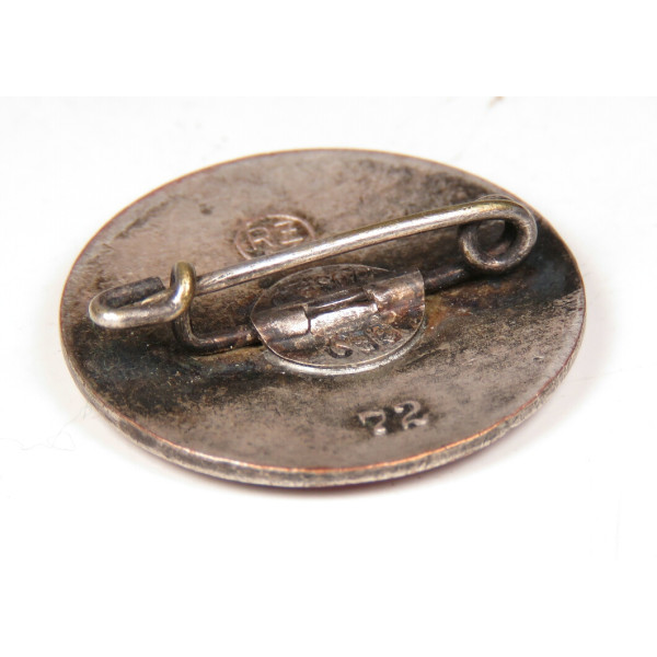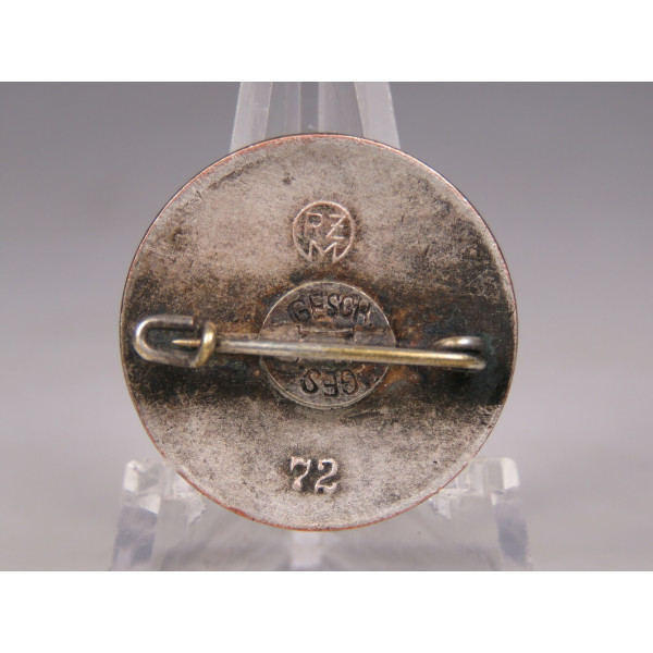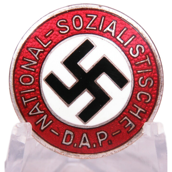 Early NSDAP party badge, pre-1936 issue. Reverse marked RZM 72. Manufactured by Fritz Zimmermann, Stuttgart. Pin assembly stamped Ges. gesch. These badges were worn for approximately ten years, which is why enamel damage and impact marks are commonly encountered. This example is preserved in exceptional condition, with excellent silver finish and perfectly smooth enamel. Mint condition, extremely rare for this type.