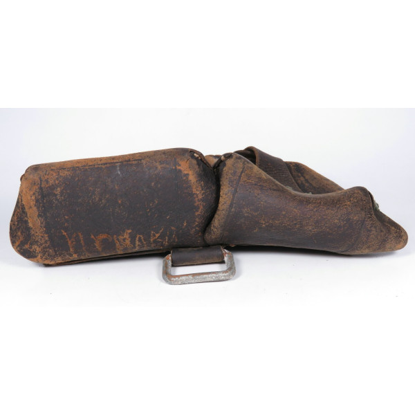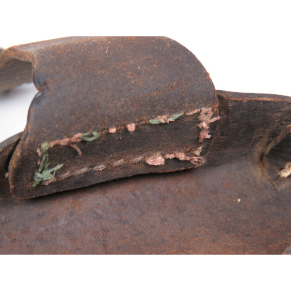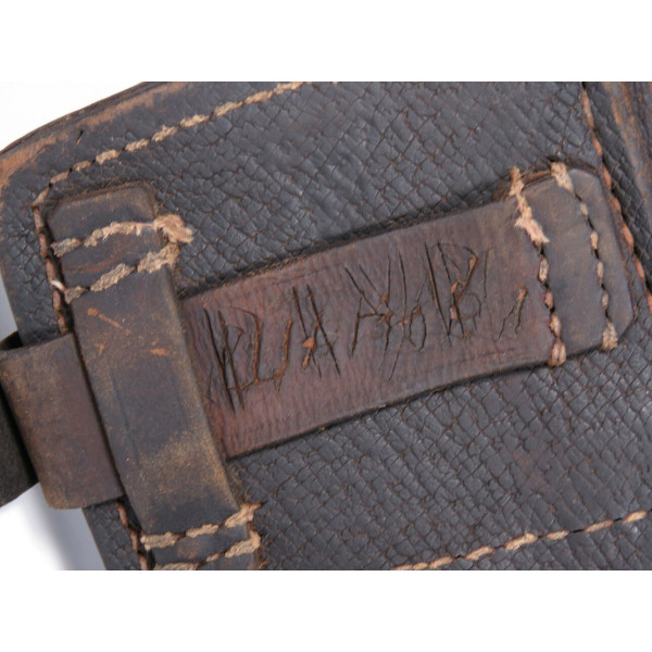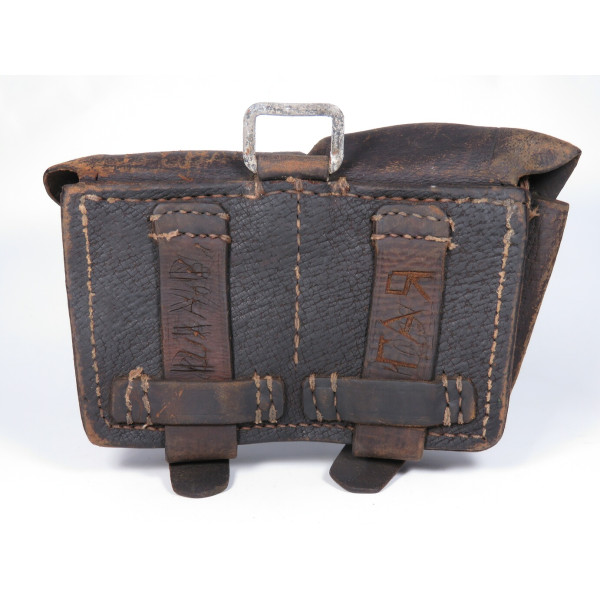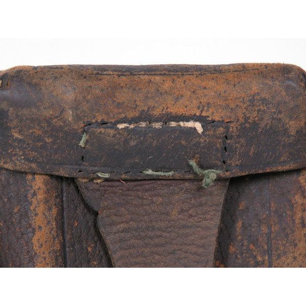 Pre-war 1938 pattern ammo pouch for the Mosin rifle with signs of extensive field wear, leather components heavily worn, some stitching has come apart or is missing, featuring battlefield repairs. Functional condition for a combat-carried item.