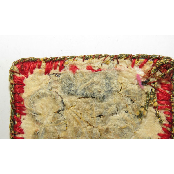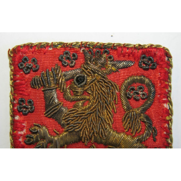 Finnish Waffen-SS volunteers arm shield first type executed on red cloth backing with gold bullion embroidery depicting the Finnish coat of arms — a lion holding a sword. A twisted border runs along the edge. Worn by Finnish Waffen-SS volunteers serving in the Nordost battalion on the Eastern Front. This example shows signs of repair and wear to the red cloth, likely due to material characteristics. Overall condition good.
