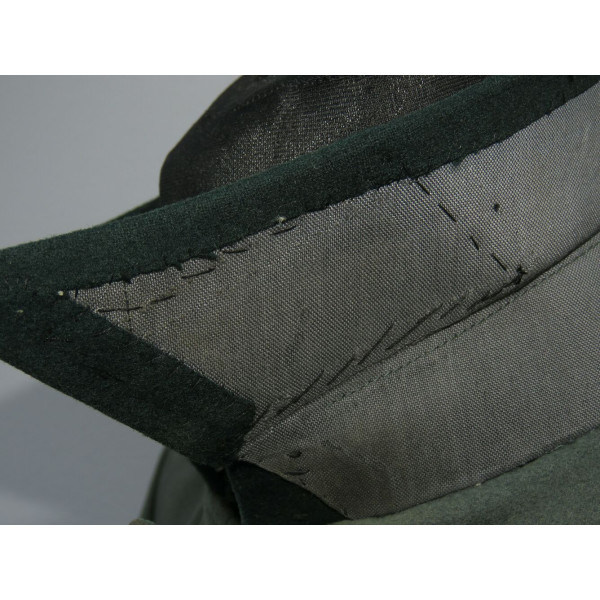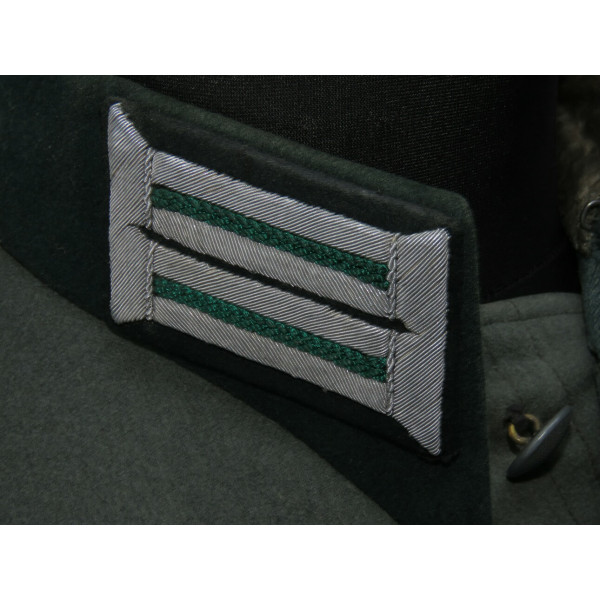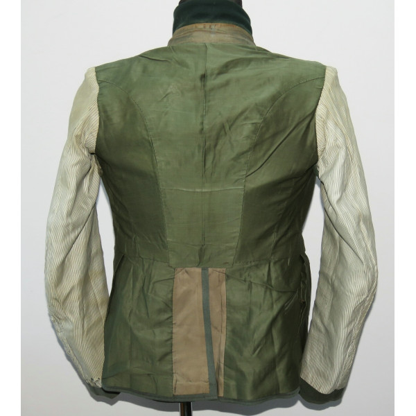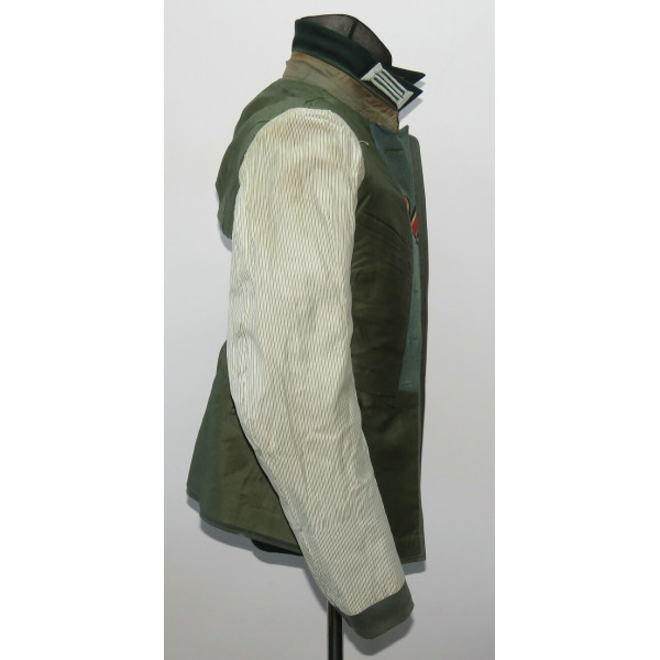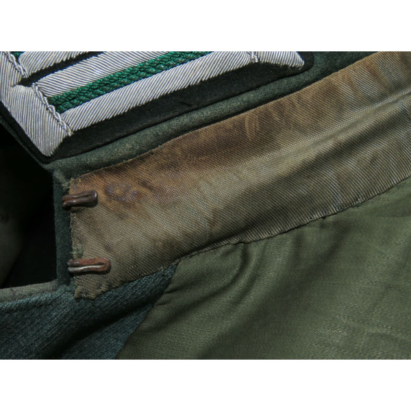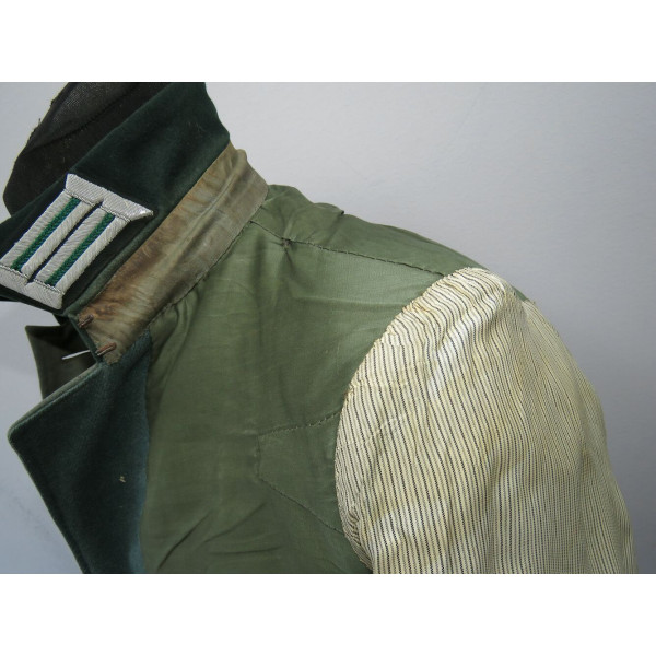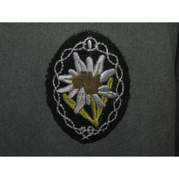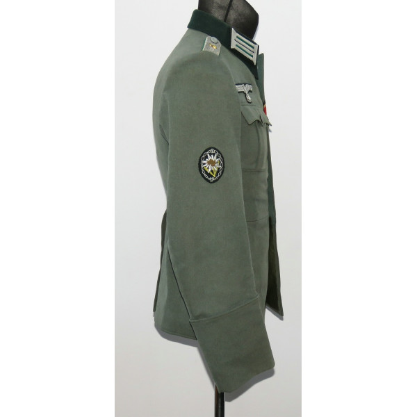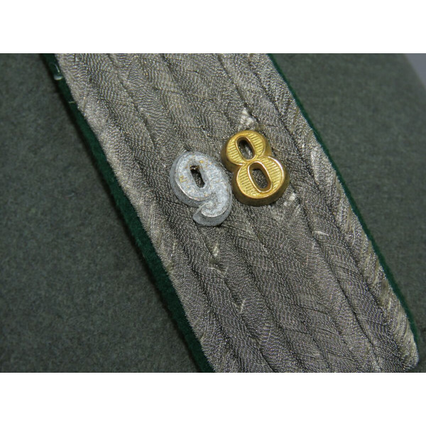 Wehrmacht Gebirgsjäger tunic of the 98th mountain regiment. Converted from an earlier pre-war parade tunic originally worn with colored piping. During service, the piping was removed and the tunic was adapted for field wear. Most likely due to the owner’s financial considerations. On the right sleeve, above the elbow, is the Edelweiss mountain troop badge - embroidered in aluminum thread. Rank lieutenant. Shoulder boards bear the number 98 indicating the 98th mountain regiment. Small size, approximately EU 46–48. Shows clear signs of use, overall condition good.