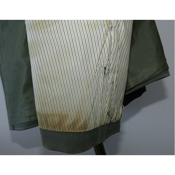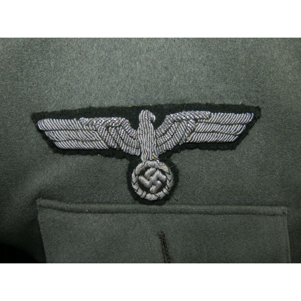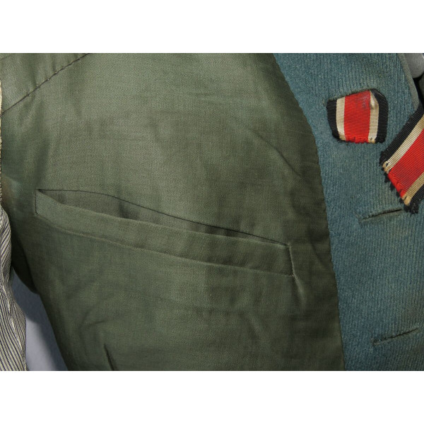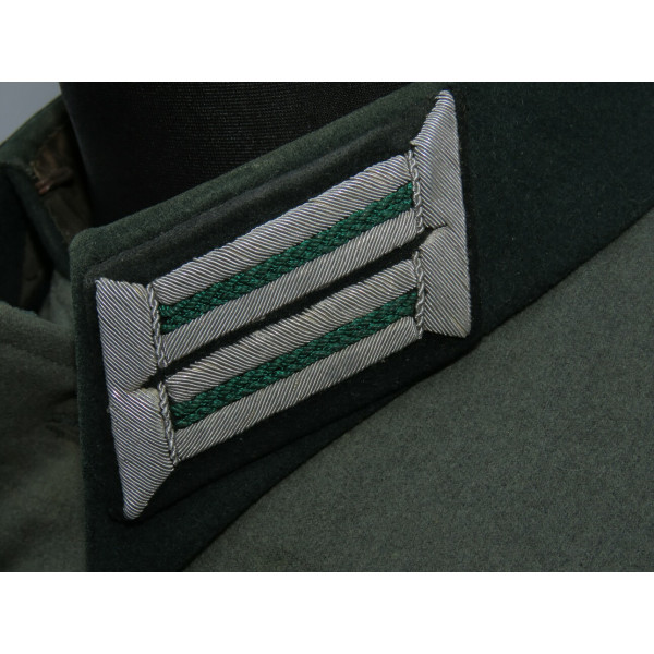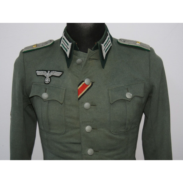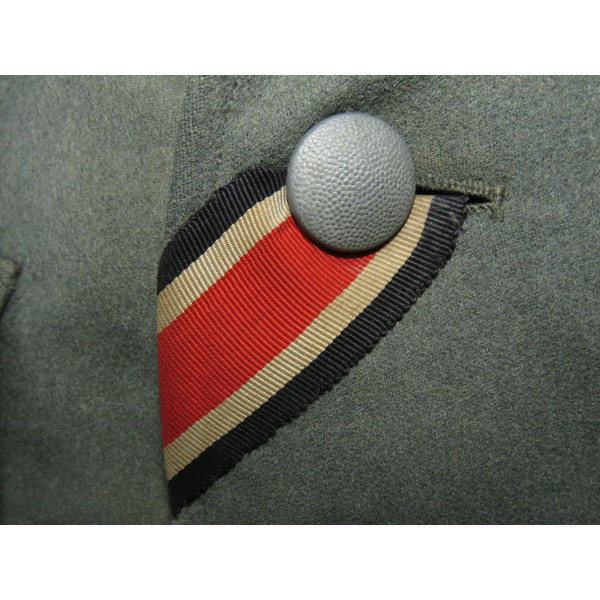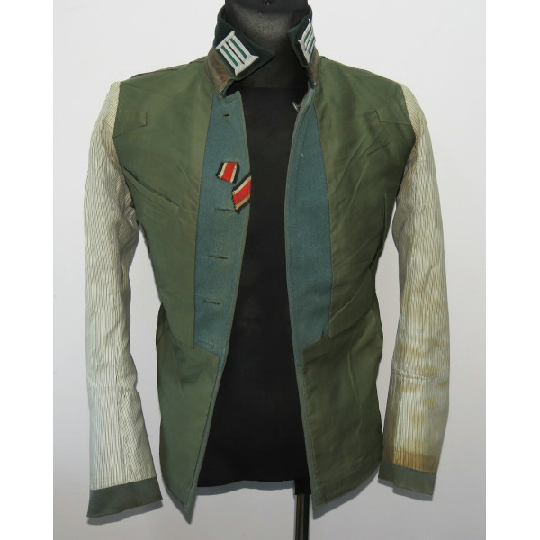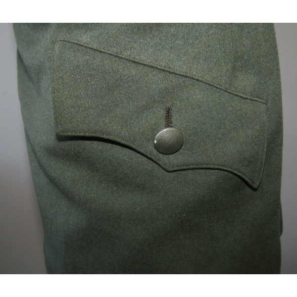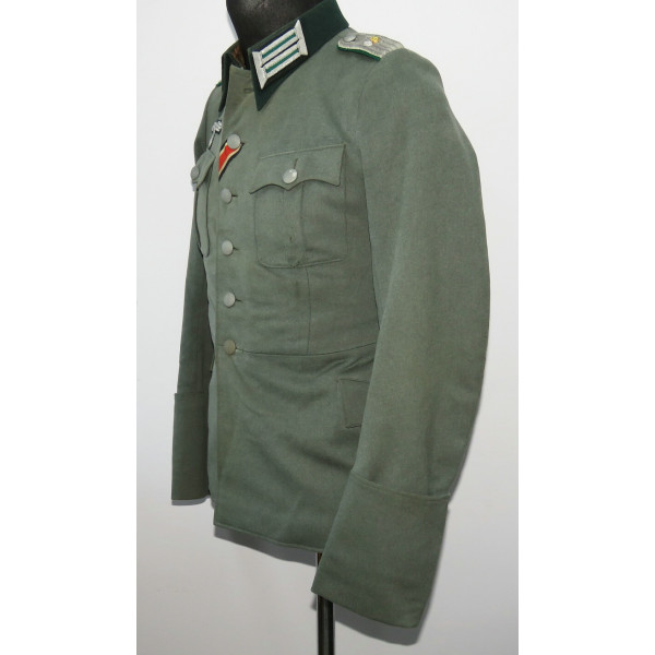 Wehrmacht Gebirgsjäger tunic of the 98th mountain regiment. Converted from an earlier pre-war parade tunic originally worn with colored piping. During service, the piping was removed and the tunic was adapted for field wear. Most likely due to the owner’s financial considerations. On the right sleeve, above the elbow, is the Edelweiss mountain troop badge - embroidered in aluminum thread. Rank lieutenant. Shoulder boards bear the number 98 indicating the 98th mountain regiment. Small size, approximately EU 46–48. Shows clear signs of use, overall condition good.
