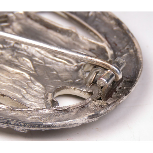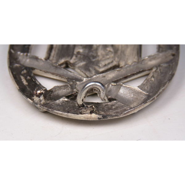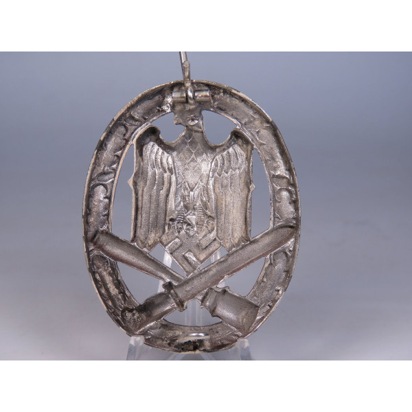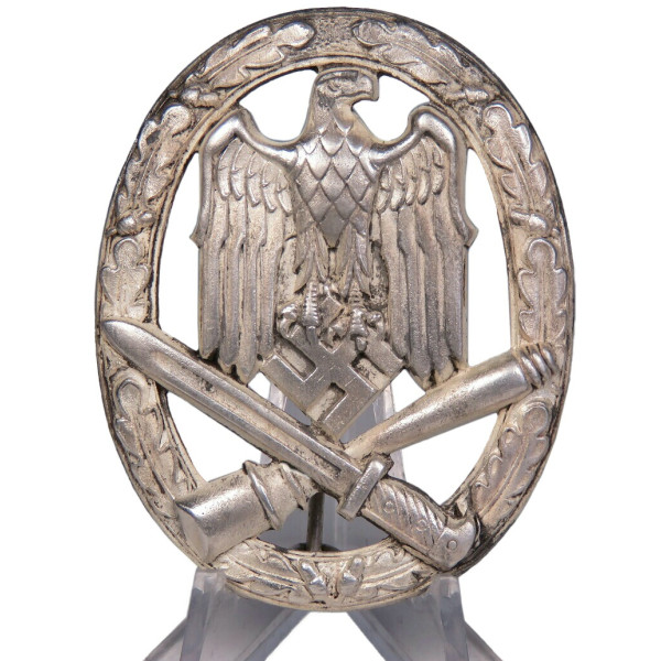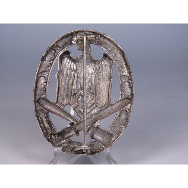 General Assault Badge in silver by Rudolf Karneth. Die-struck zinc construction with a hollow back reverse. The silver finish is very well preserved, with a light patina that enhances the fine detail on the eagle, wreath, and weaponry.