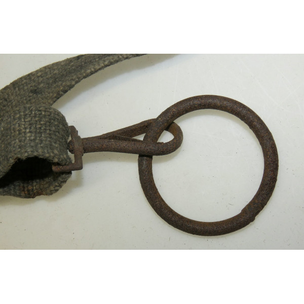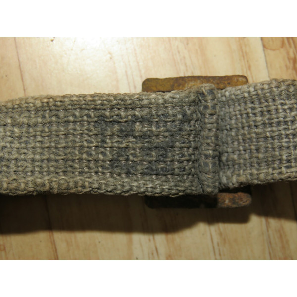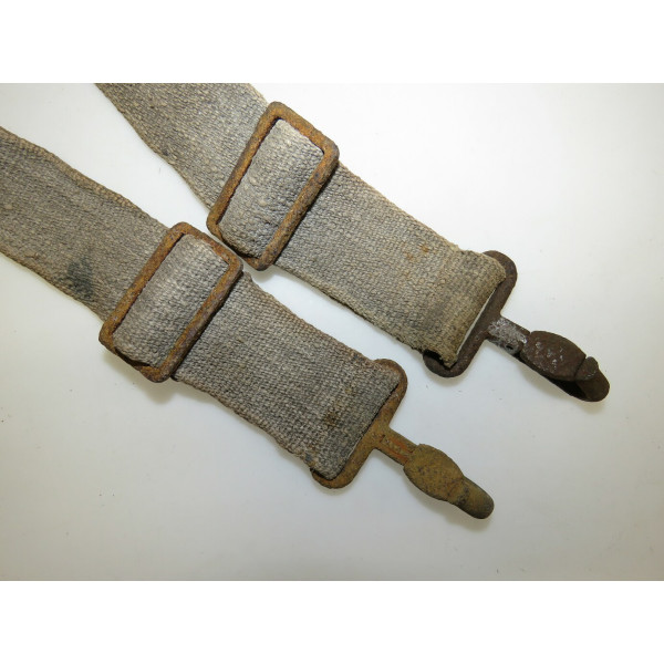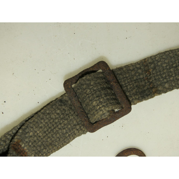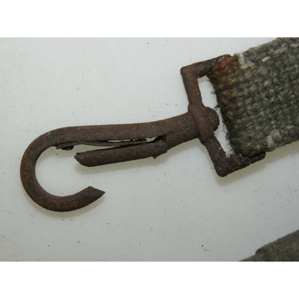 Factory-produced ammunition case carrier set composed of at least two types of mid-war webbing material in feldgrau color. All stitching is factory-applied, fully intact, and adjustable in size. The central strap is clearly stamped "HCY42", confirming production in 1942. Metal hardware is unfortunately heavily rusted, with only two spring-loaded clips functioning properly. The remaining two clips are seized and require restoration to regain mobility. Remarkably, the webbing itself shows minimal rust staining from the hardware. Included with this set is an additional long strap found together, likely also intended for carrying ammunition boxes. This item was used on the Eastern Front and was discovered on a surviving farmstead near the Tannenberg Line (Tannenbergstellung), site of fierce fighting during the Battle of Narva in 1944, Estonia