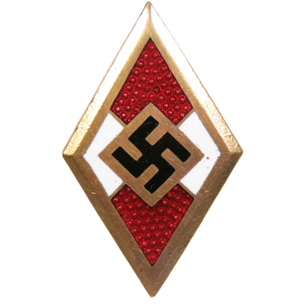 Gold Hitlerjugend membership badge, with fully preserved gilding. This example is the B-Ausgabe variant, issued as a duplicate for wearing on a second uniform or as a replacement if the original was lost. Marked RZM M1/120, the manufacturer is Wilhelm Deumer, Lüdenscheid. Excellent collectible condition.