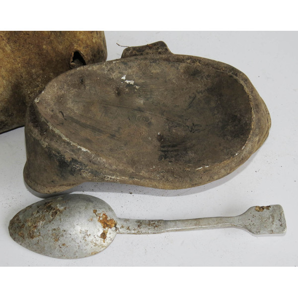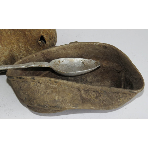 Heavily battlefield damaged equipment items of Red Army, mess kit and spoon found in Leningrad area.
