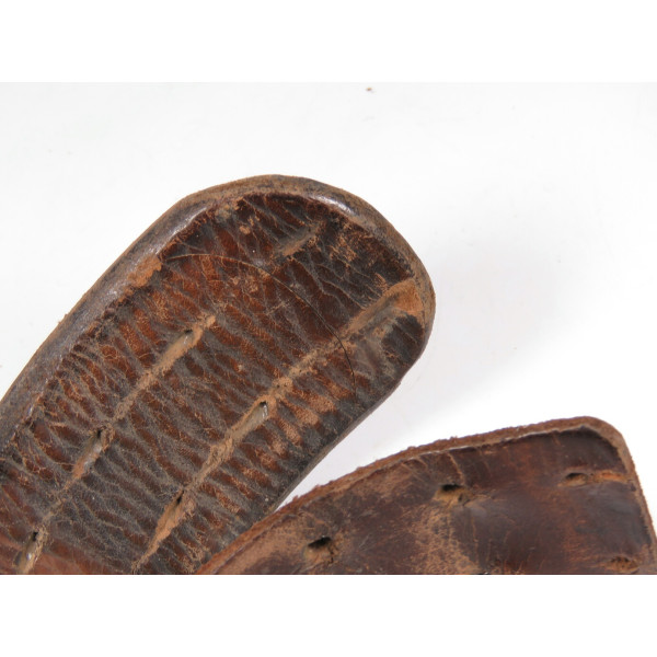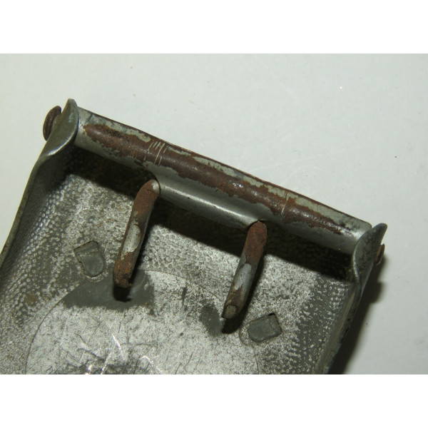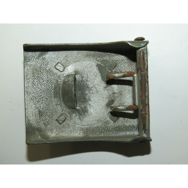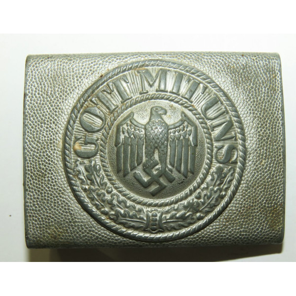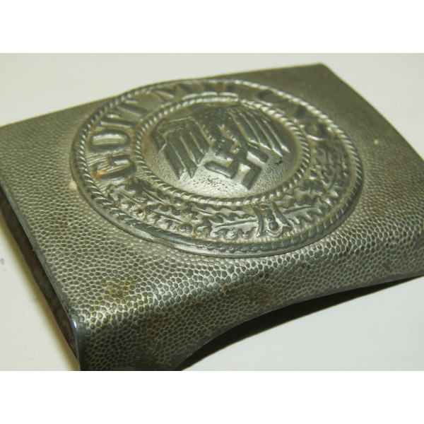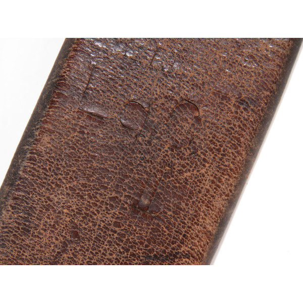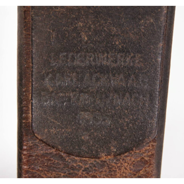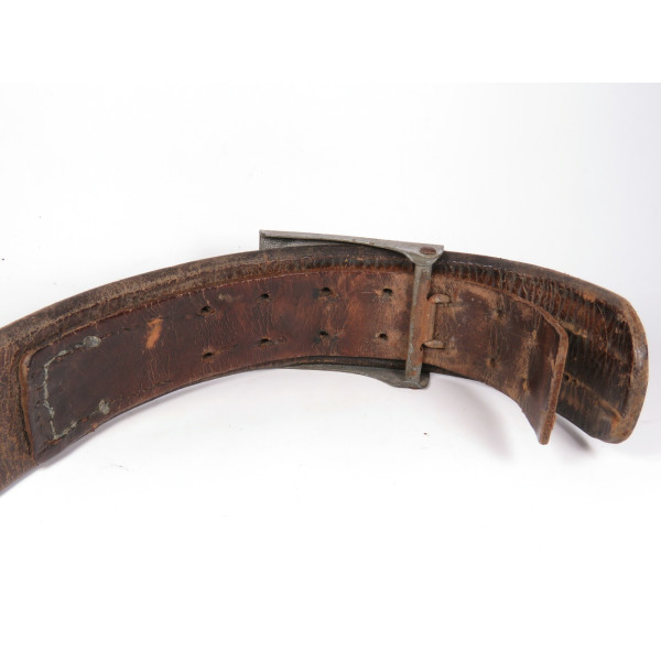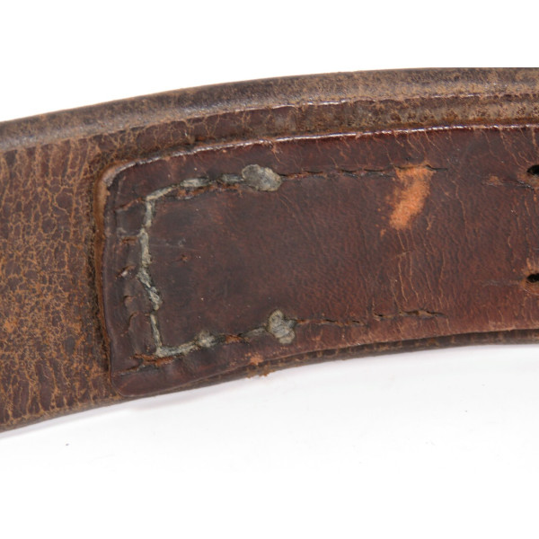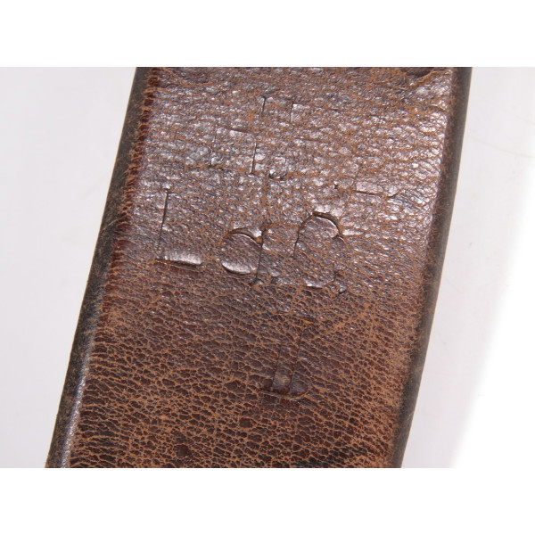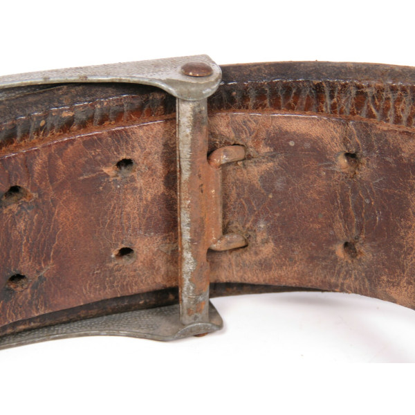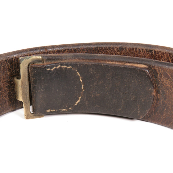 Zinc buckle with Gott Mit Uns applied medallion on an early 1935 leather combat belt, featuring a nickel silver catch and marked Lederwerke Karl Aqua A.G. Bad Kreuznach 1935. The belt is complete with the buckle, and the leather strap carries the appropriate stamp; the reverse bears the unit marking H.F.Ld.Z II. The belt has been shortened, typical for Eastern Front use where winter clothing required tighter adjustment. Excellent condition for a field-used example.