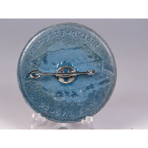 Badge of the Hitlerjugend organization with the inscription "Jugendherberge Marienberg", made of pressed cardboard. The front depicts a building in grey-blue tones, with a faded surface. Condition shows signs of age