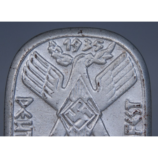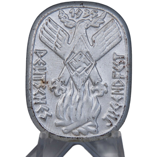 Badge commemorating the 1935 Jugendfest. The obverse shows an eagle clutching a swastika, standing on a bonfire, with the date “1935” above. The inscription DEUTSCHES JUGENDFEST runs along the sides.