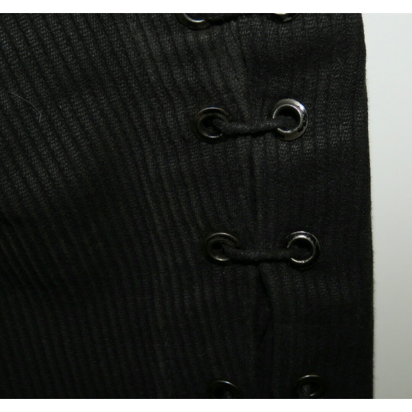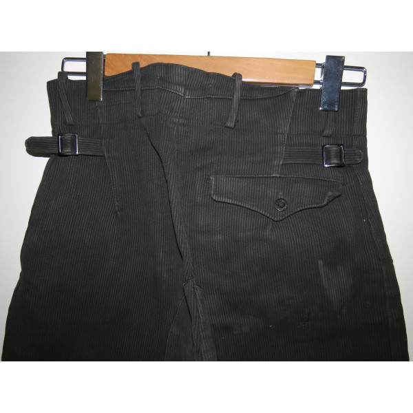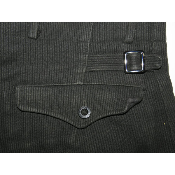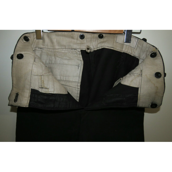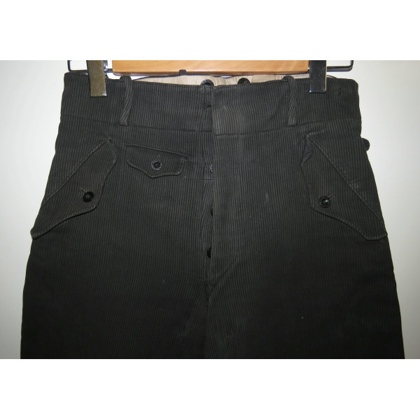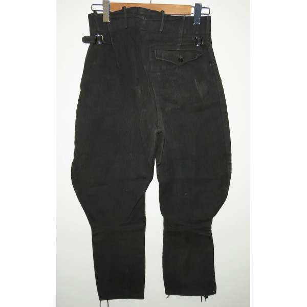 Black Hitlerjugend leader breeches made of cord fabric. The garment shows pronounced signs of use. One small repair is present on the rear area, along with minor holes. The original RZM tag, originally located at the waistband, is missing due to wear. All buttons are original, correctly sewn, and have not been replaced or reattached. The breeches feature black buttons marked HJ-D.J., all present and matching. Waist size 80 cm, length 88 cm.