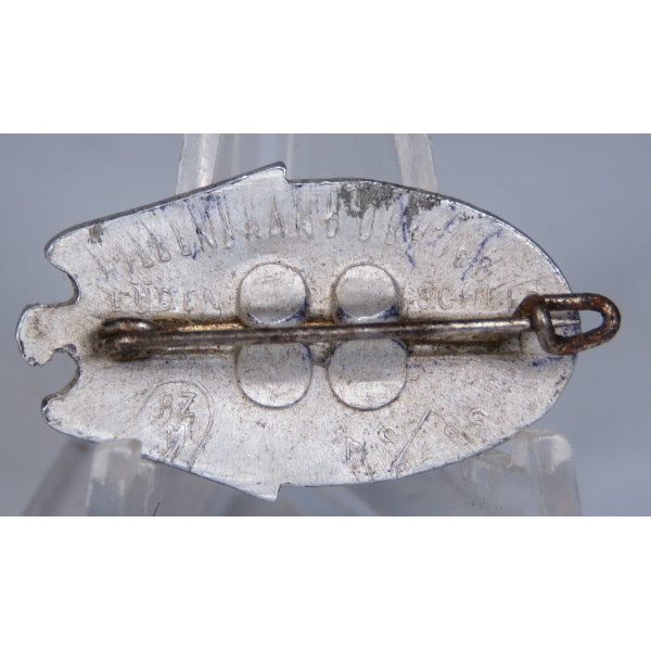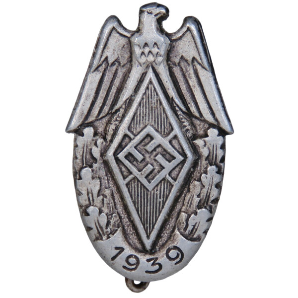 A rare Hitlerjugend event badge (Veranstaltungsabzeichen) issued for the 1939 youth competitions. Struck in aluminum and marked RZM M9/89 for Willebrandt, Lüdenscheid. The obverse features the Reich eagle above the HJ diamond with swastika, flanked by oak leaves, with “1939” at the bottom. Crisp details, clear maker’s mark, and excellent overall preservation with light natural patina.