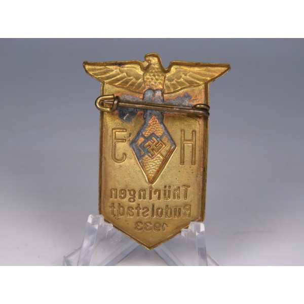 Bronze, stamped. Commemorative Hitler Youth badge issued for the 1933 event in Rudolstadt, Thuringia. Features the HJ diamond with swastika at center, flanked by the letters H and J, with a spread-winged eagle above. Inscription at the bottom reads Thüringen Rudolstadt 1933. Excellent condition with attractive patina.