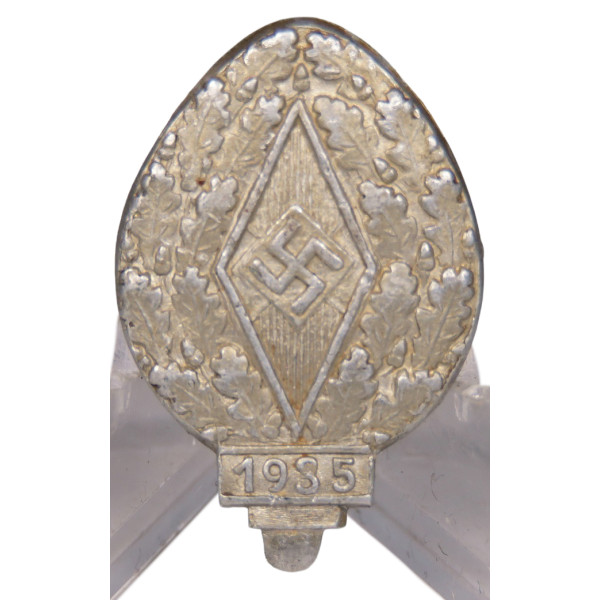 HJ Siegernadel der Reichssportwettkämpfe 1935, a pin awarded in connection with the national sports competitions of the Hitler Youth. Classified as an Ehrenzeichen within the structured physical training system of the Reich youth. Produced in typical mid-1930s HJ style. Die-struck in aluminum. Reverse marked PSL – Paul Schulze & Co., Lübeck. Excellent condition.