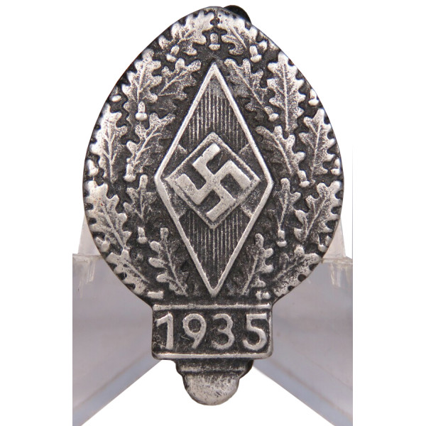 Participant badge for the 1935 Hitlerjugend meeting. The obverse features a diamond with swastika, surrounded by oak leaves, and the date “1935” at the bottom. Struck from a silvered alloy, with attractive patina and minor traces of wear. Good collectible condition.