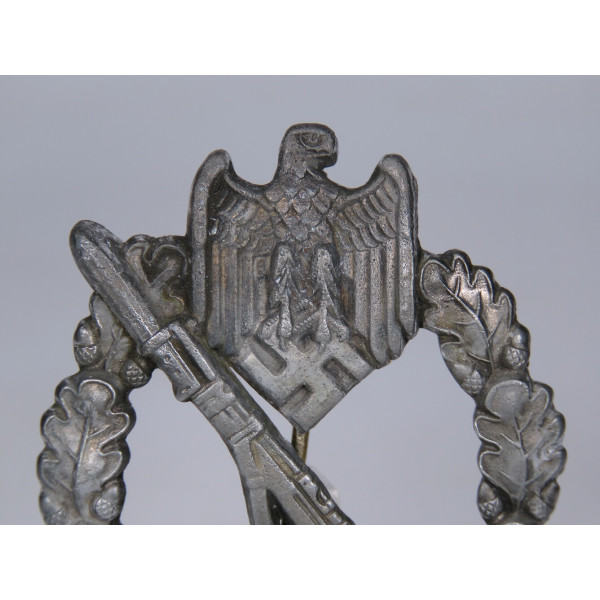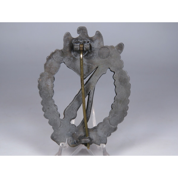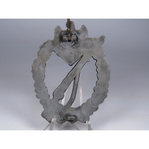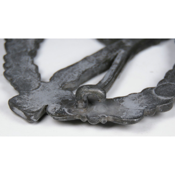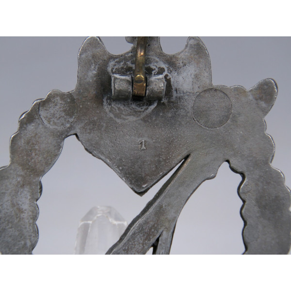 The Infanterie Sturmabzeichen in Bronze made by Assmann features the technological stamp 1 on the reverse, a marking found on all infantry assault badges by this manufacturer. The reverse also shows four punch marks created during the technical stamping process. The bronze finish has absorbed into the metal, diffusing into the alloy and producing the stable period surface tone.