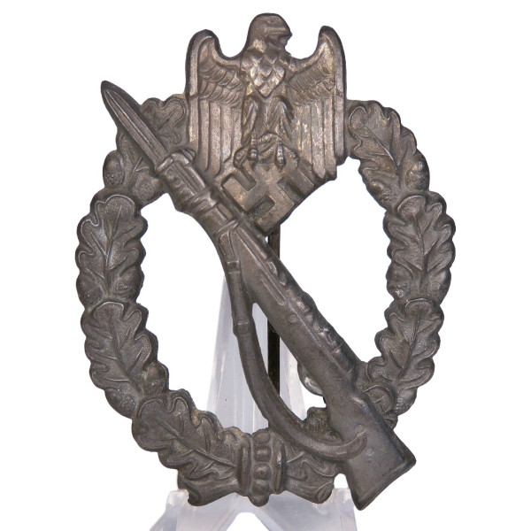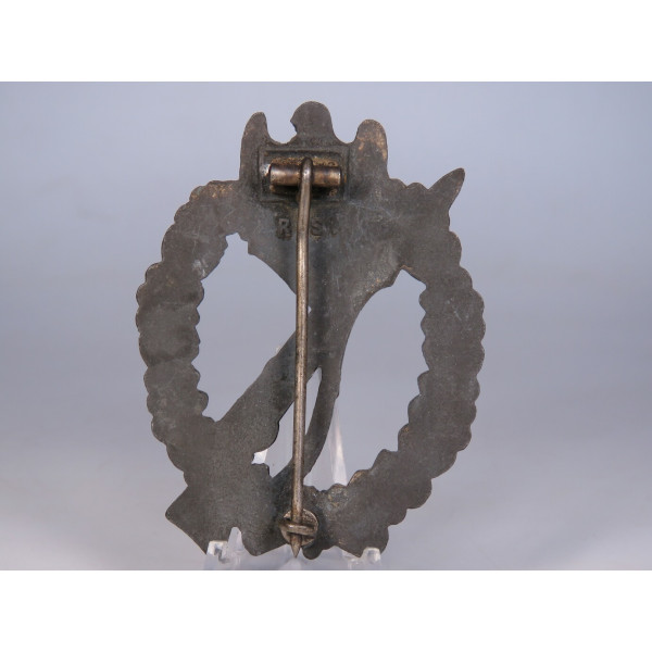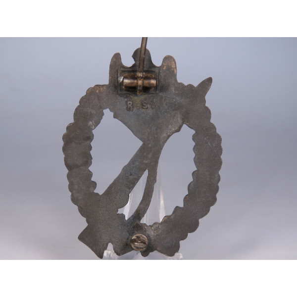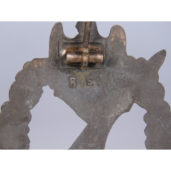 Infantry Assault Badge in silver manufactured by Rudolf Souval. The reverse bears the R.S. maker mark. The badge is made of zinc. The silver finish has almost completely diffused, which is typical for zinc pieces. Despite this, the badge remains in excellent condition with crisp detail and no damage.