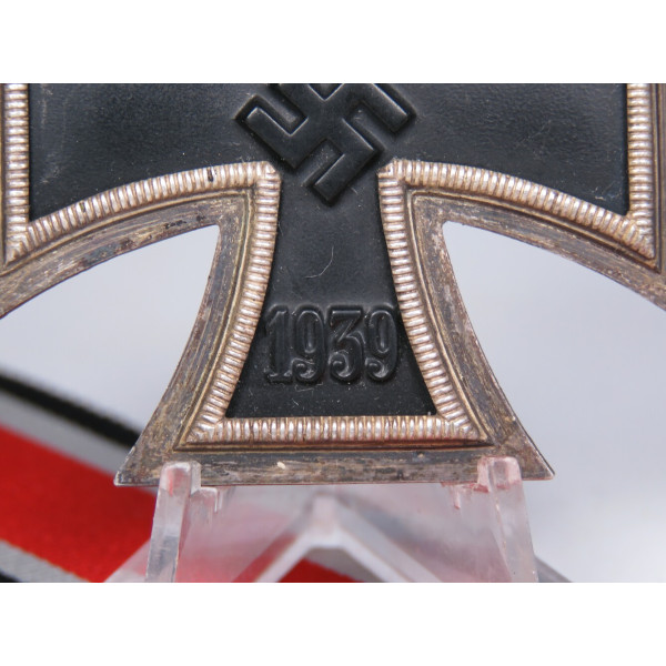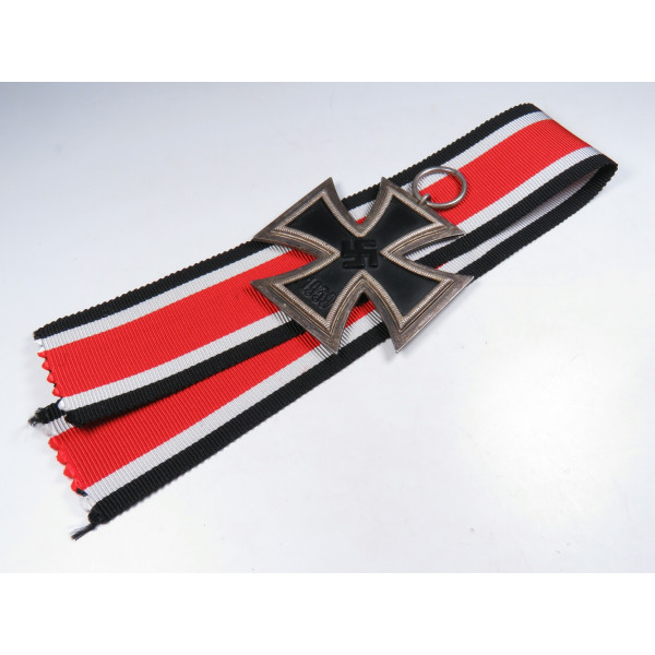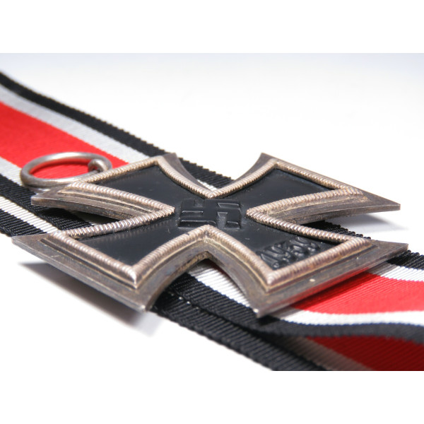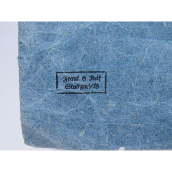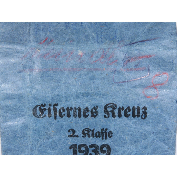 Iron Cross 2nd Class 1939, Frank & Reif Stuttgart (Übergröße / Knight’s Cross size) Iron Cross 2nd Class of 1939, manufactured by Frank & Reif, Stuttgart, produced in the Übergröße format, corresponding to the size of a Knight’s Cross. Iron core with deep, even black finish, silvered neusilber frame with natural patina. Suspension ring without maker’s mark, which is typical for all crosses from this manufacturer. Original full-length ribbon, without fading or damage. Original packet marked Eisernes Kreuz 2. Klasse 1939 and Frank & Reif, Stuttgart, made of blue paper with storage traces. A rare and fully correct Übergröße set from a single maker.
