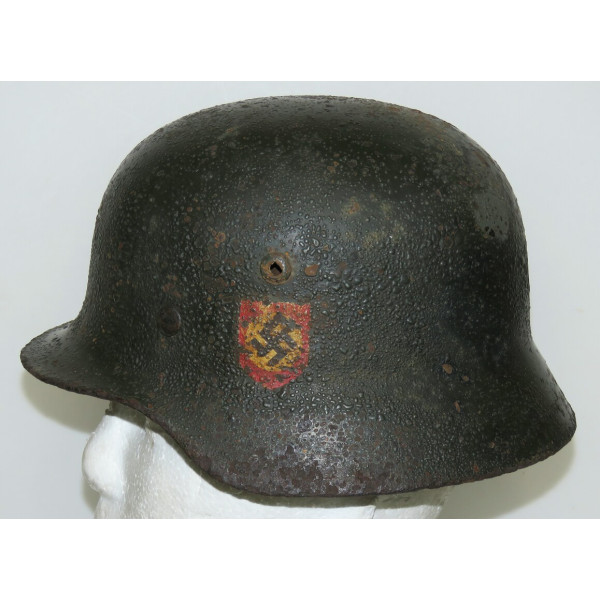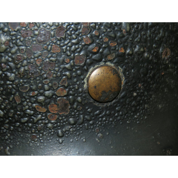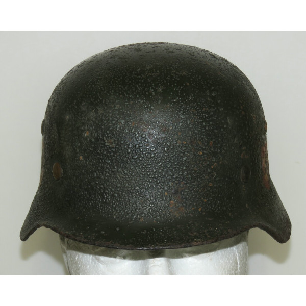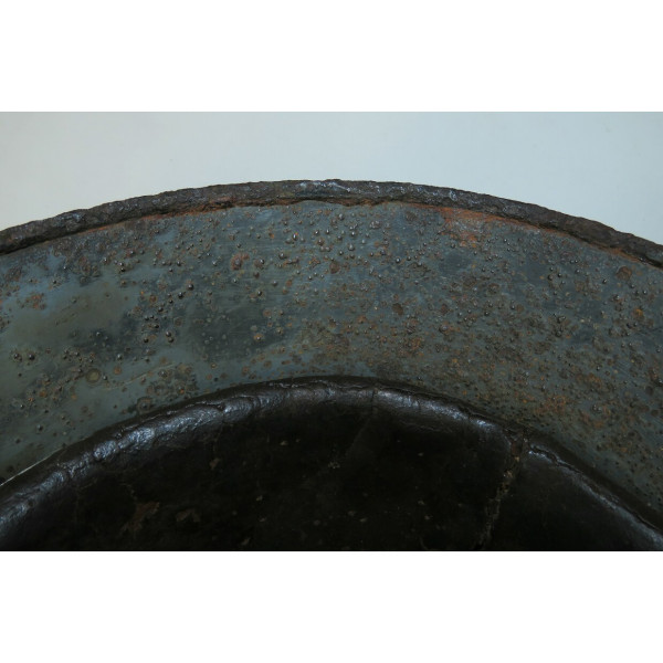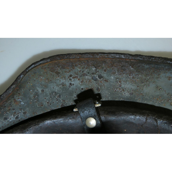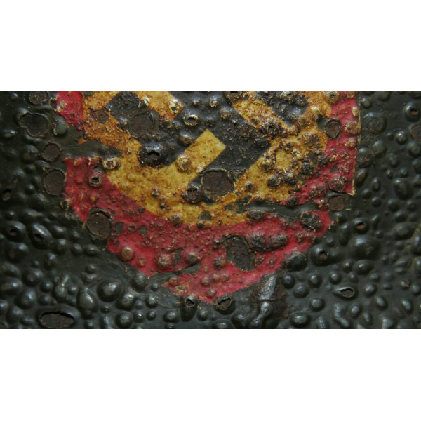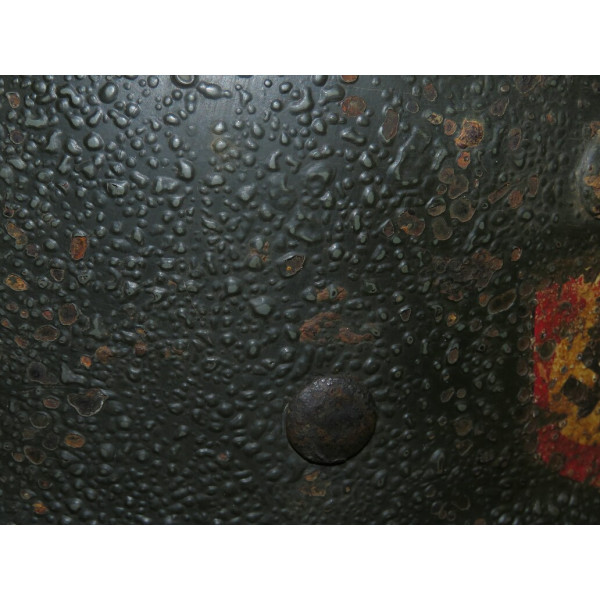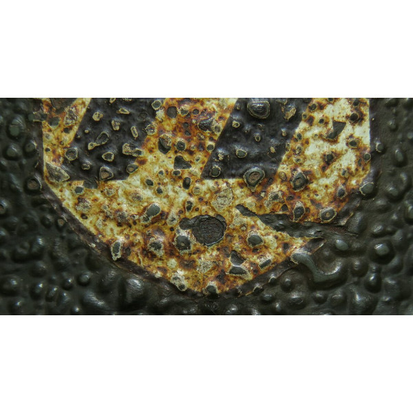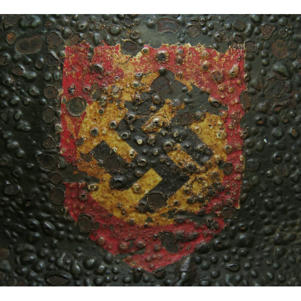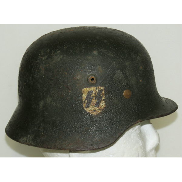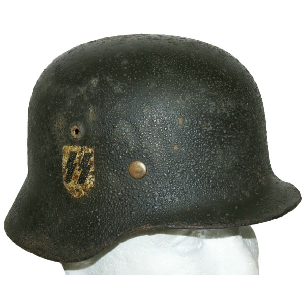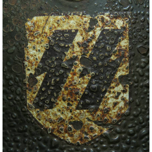 Elmo della SS Verfügungstruppe con doppie decalcomanie. Reperto archeologico precoce, completamente ricoperto dalla vernice originale, che presenta uno strato secondario. Al di sotto, sono visibili tracce di una precedente tonalità grigia tipica dei primi elmetti SS. L'elmo è completo di fodera e sottogola originali. Entrambe le decalcomanie sono eccezionalmente ben conservate. La vernice presenta bolle diffuse, causate dall'età o dall'esposizione al calore. Un magnifico esempio di elmetto SS del primo periodo. Il marchio del produttore è illeggibile, ma molto probabilmente è ET-62. NB! Si tratta di un oggetto in consegna. La spedizione ha un periodo di controllo di 14 giorni dal ricevimento dell'articolo, dopodiché qualsiasi restituzione è nulla. Nessun motivo è accettabile per la restituzione di articoli in conto vendita, poiché abbiamo dato la maggior parte del denaro al mittente.