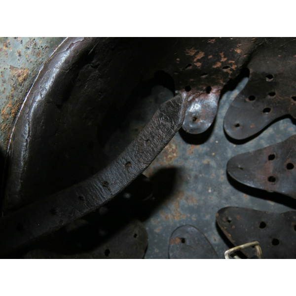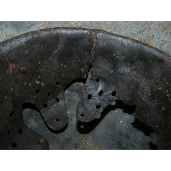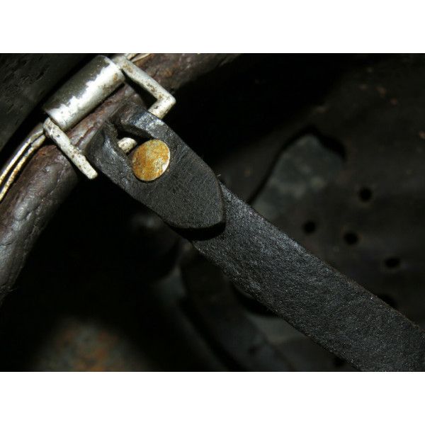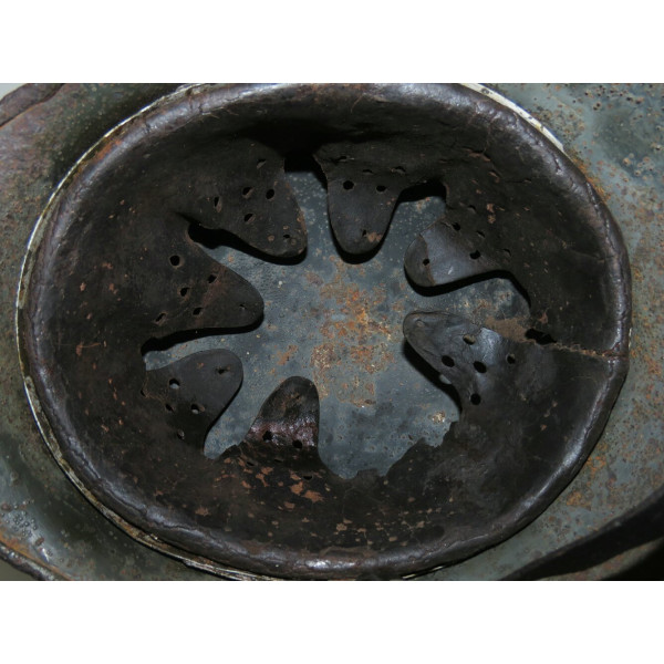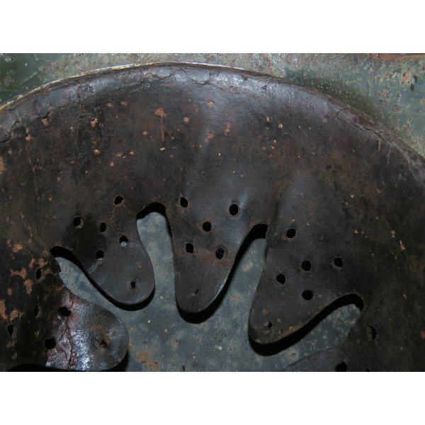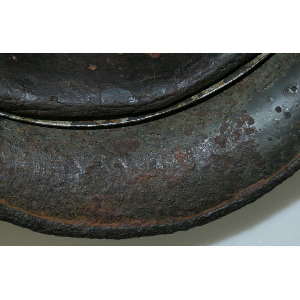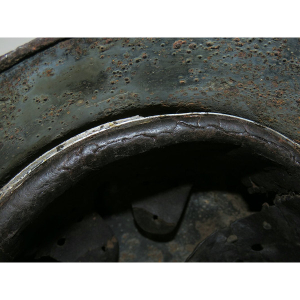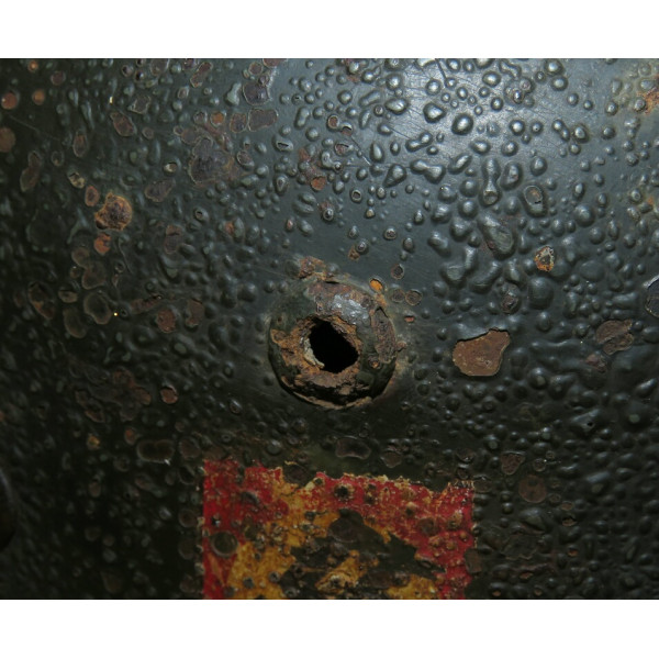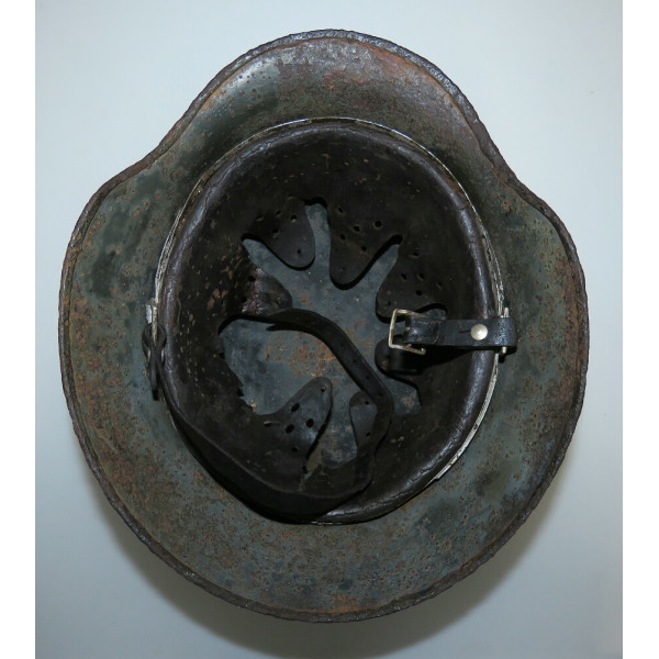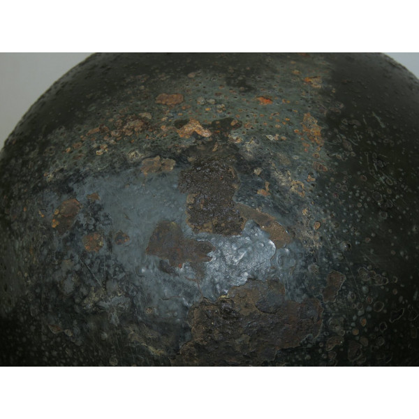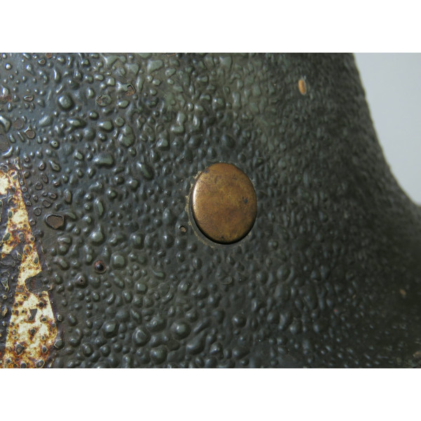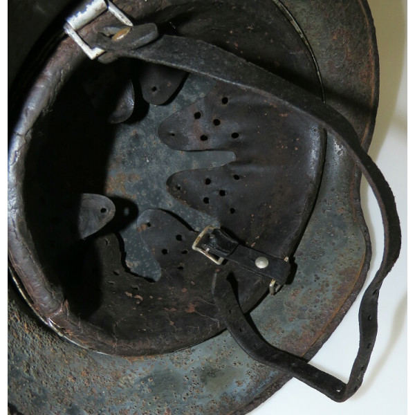 Elmo della SS Verfügungstruppe con doppie decalcomanie. Reperto archeologico precoce, completamente ricoperto dalla vernice originale, che presenta uno strato secondario. Al di sotto, sono visibili tracce di una precedente tonalità grigia tipica dei primi elmetti SS. L'elmo è completo di fodera e sottogola originali. Entrambe le decalcomanie sono eccezionalmente ben conservate. La vernice presenta bolle diffuse, causate dall'età o dall'esposizione al calore. Un magnifico esempio di elmetto SS del primo periodo. Il marchio del produttore è illeggibile, ma molto probabilmente è ET-62. NB! Si tratta di un oggetto in consegna. La spedizione ha un periodo di controllo di 14 giorni dal ricevimento dell'articolo, dopodiché qualsiasi restituzione è nulla. Nessun motivo è accettabile per la restituzione di articoli in conto vendita, poiché abbiamo dato la maggior parte del denaro al mittente.