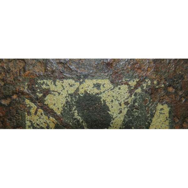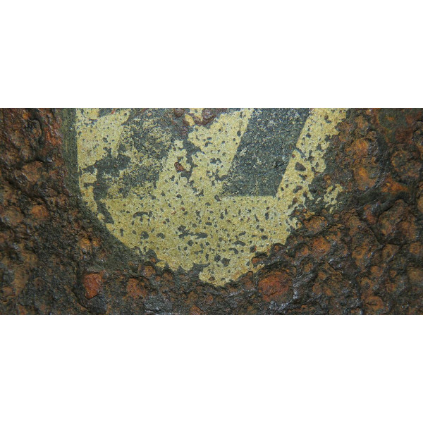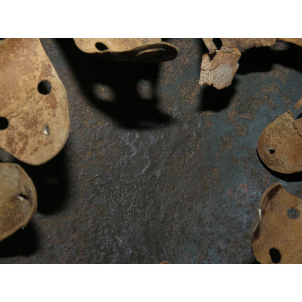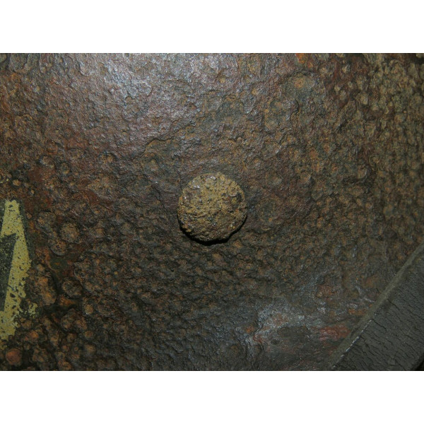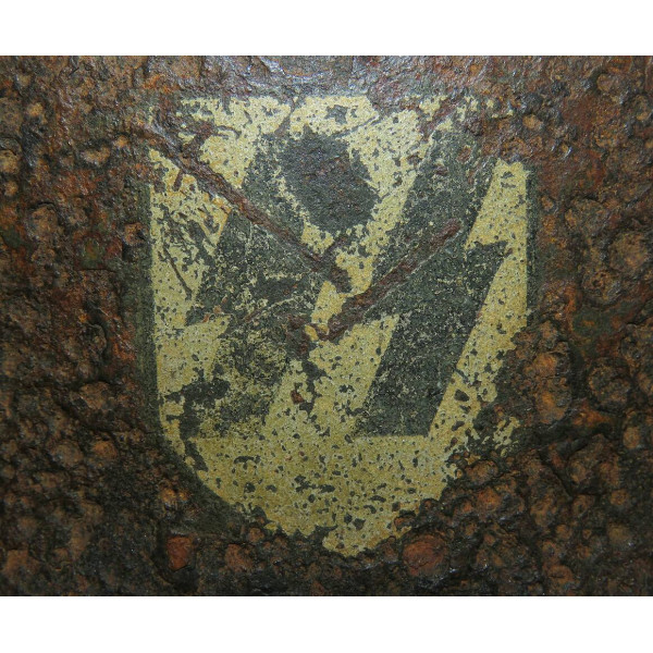 I marchi del produttore non sono più leggibili a causa della corrosione, rendendo impossibile l'identificazione. Un cimelio da campo pesantemente usurato con una decalcomania SS sorprendentemente ben conservata.