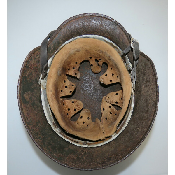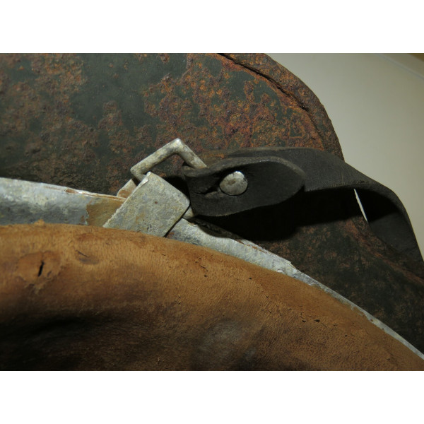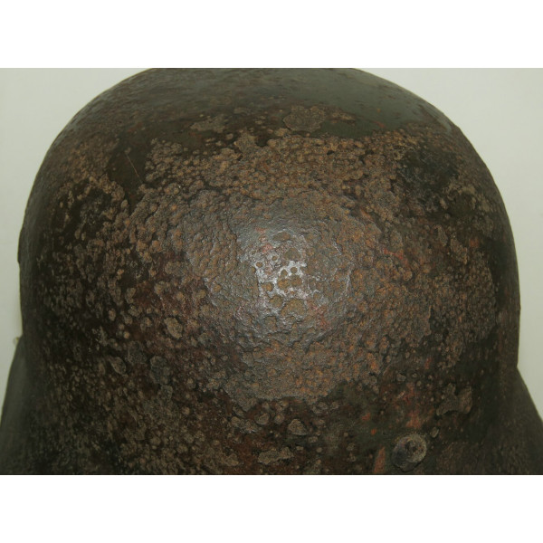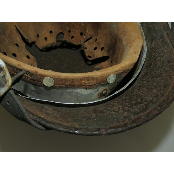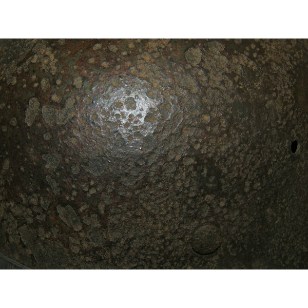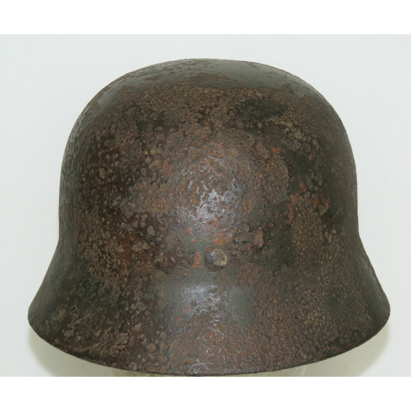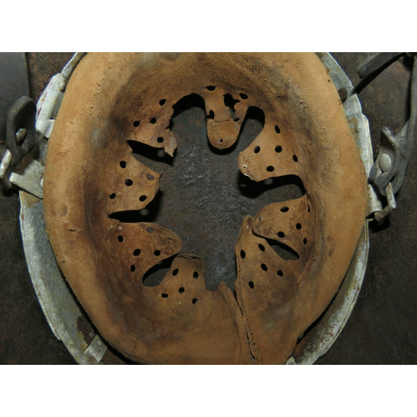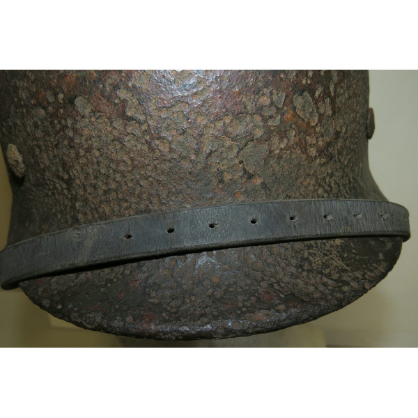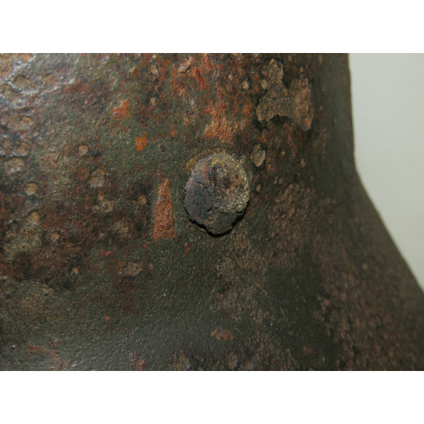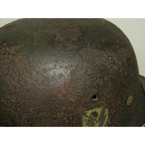 Elmetto in acciaio Waffen-SS M40, taglia 64, trovato battlefiald. Esemplare scavato con pesanti perdite di metallo e profonda corrosione su tutta la calotta. La decalcomania SS sul lato destro rimane ben visibile e ben definita nonostante le condizioni generali.