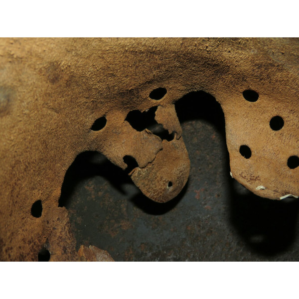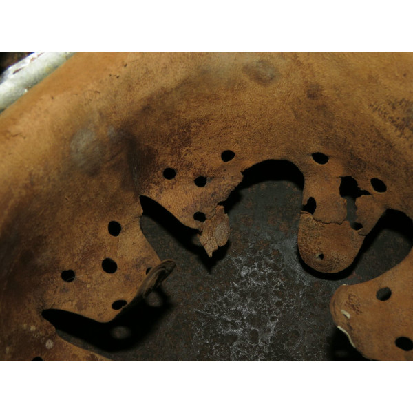 Tracce di restauro con epossidica sono presenti in diverse aree, soprattutto lungo il bordo e nelle sezioni con maggiori perdite di materiale. La fodera sembra provenire da un altro elmo scavato di tipo simile e non è originale di questa conchiglia.