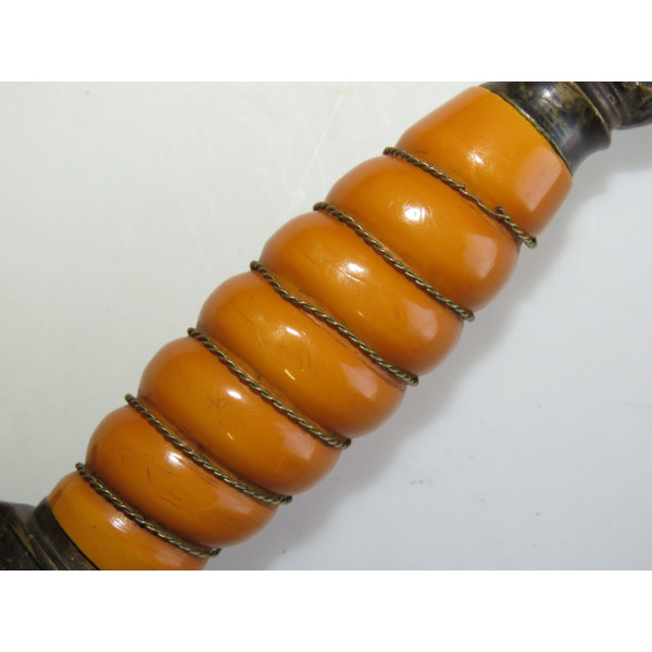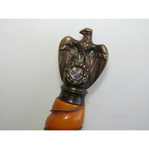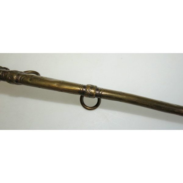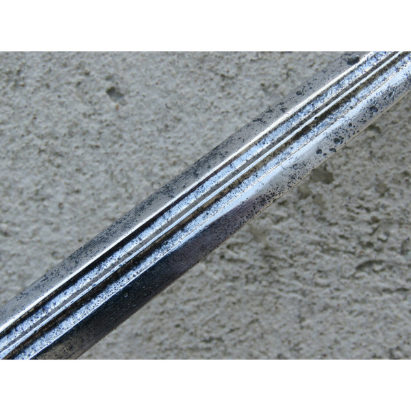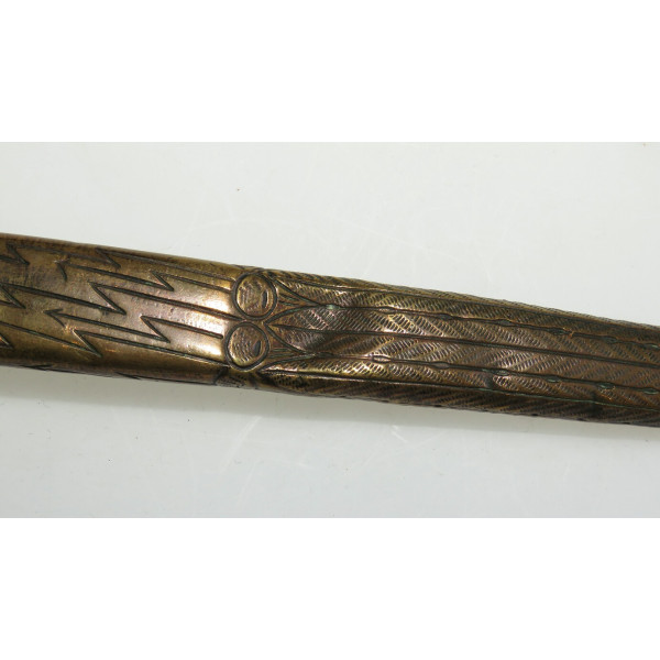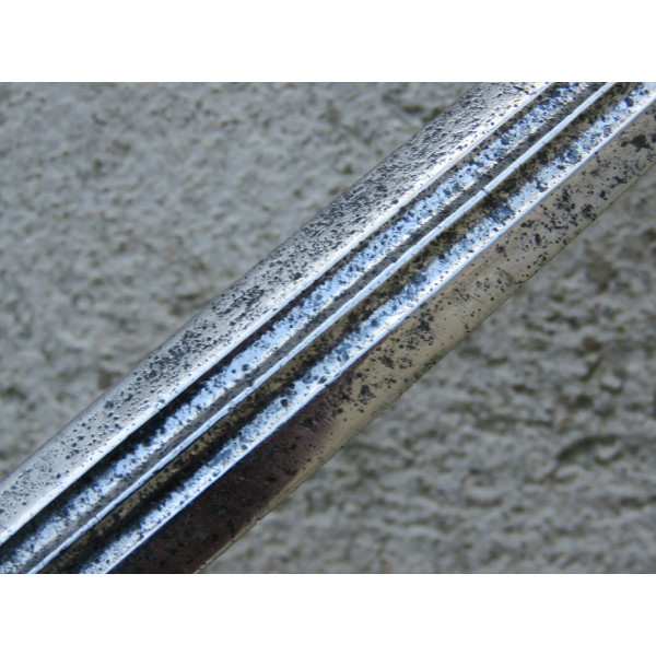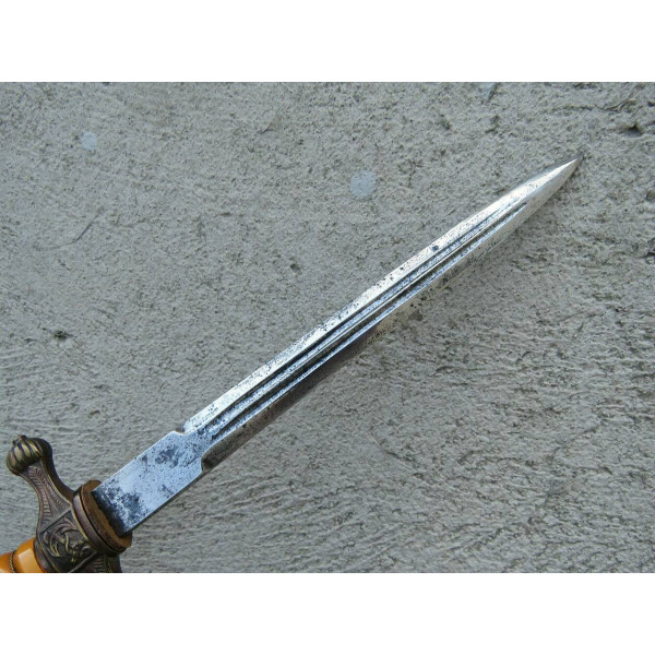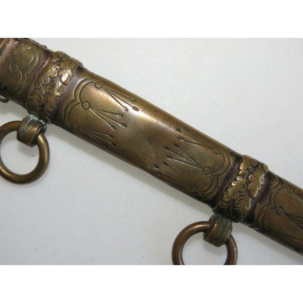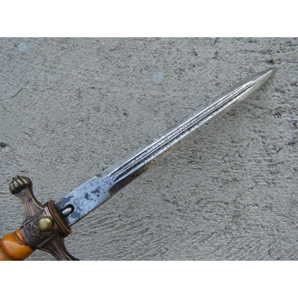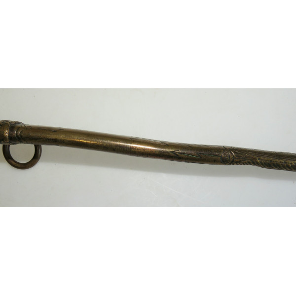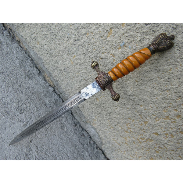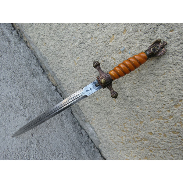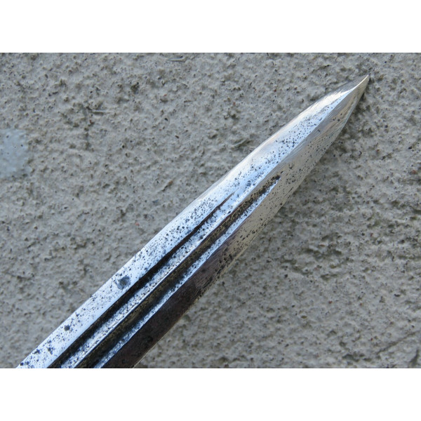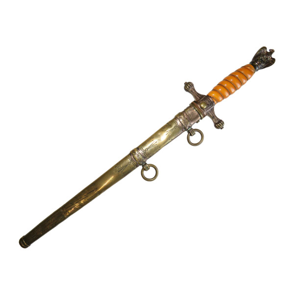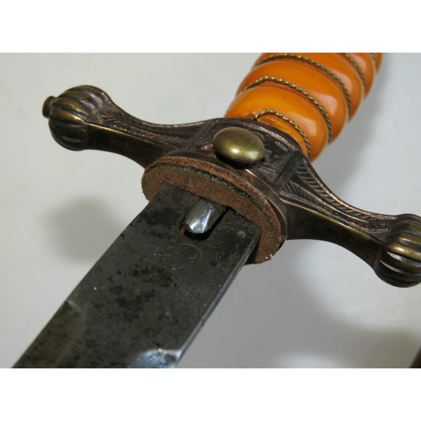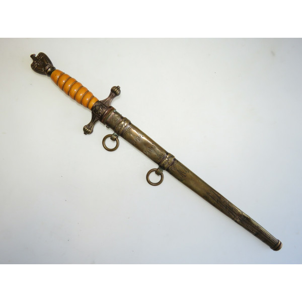 Kriegsmarine (KM) officer dagger manufactured by Eichhorn Solingen. The blade bears the Eichhorn trademark depicting a squirrel. The dagger has survived extremely harsh conditions. The blade is damaged, with a broken tip and heavy corrosion. The metal fittings appear to have been cleaned. The orange grip is fitted with newly installed wire. The pommel, crossguard, release button, and scabbard are original components, showing dents and significant age-related wear.