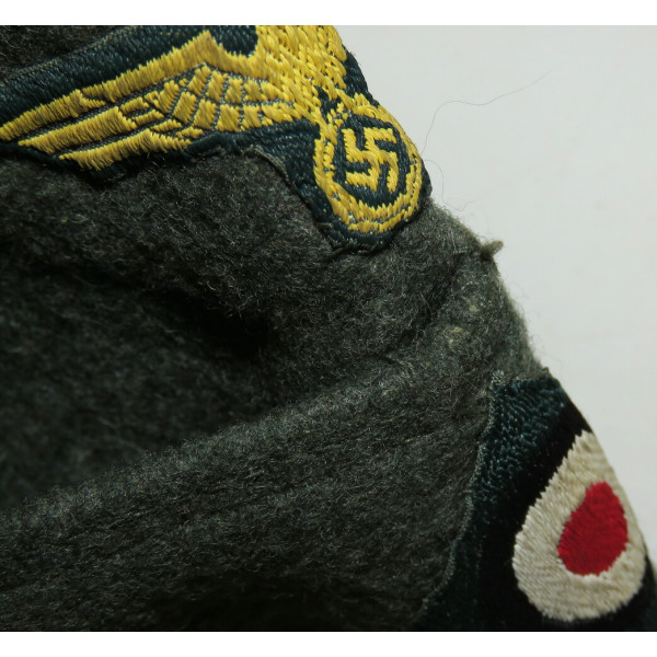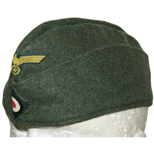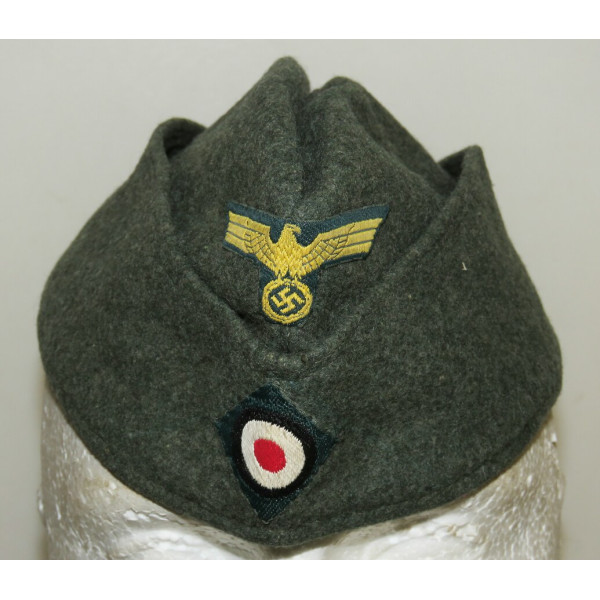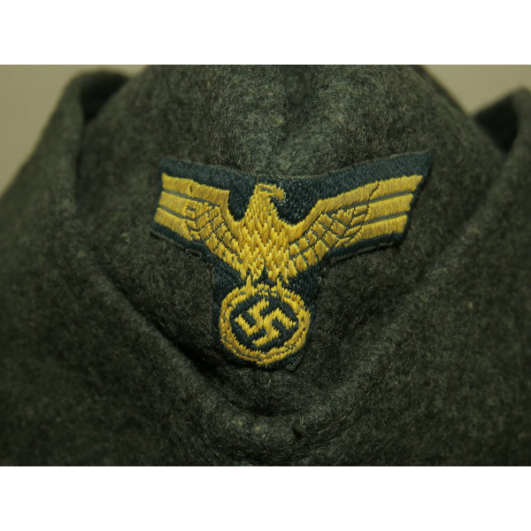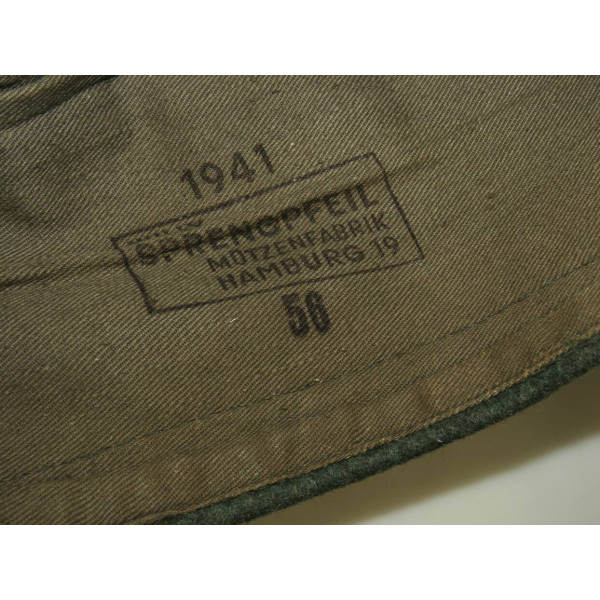 Side cap for coastal units of the Kriegsmarine, 1940 pattern, showing light wear and remaining in excellent condition. The lining bears a 1941 rectangular stamp of Willy Sprengpfeil Mützenfabrik Hamburg 19, size 56.