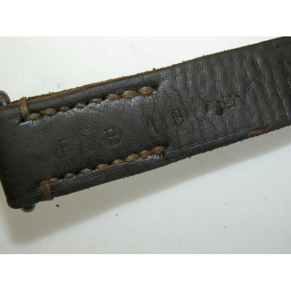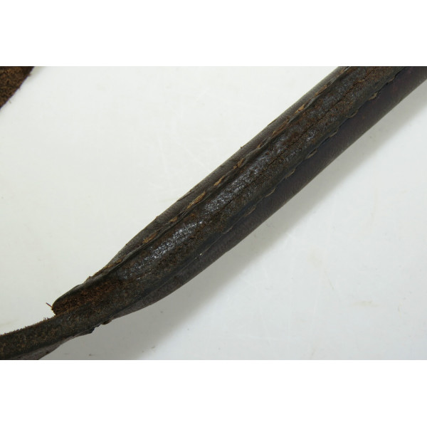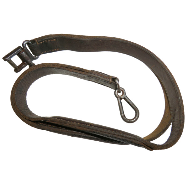 Leather strap for MG34 or MG42 machine guns in excellent condition, with signs of use, the strap retains its brown leather color, the leather remains soft and usable, Waffenamt markings are present on the leather body and on the metal hook