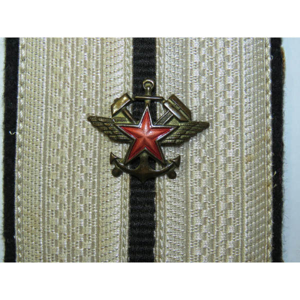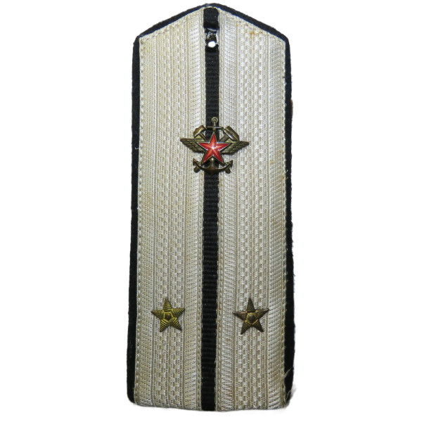 Lieutenant RKKA railway troops shoulder board, 1943 pattern, produced as German reparation. The main part consists of two white cellon braids with a central black stripe, separately sewn underneath. The reverse is made of brownish cotton cloth used for NSDAP party uniforms. The strap is made from German field cloth. Likely production dating to 1945–1946, good condition.