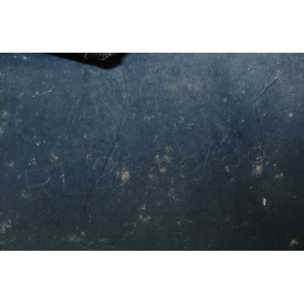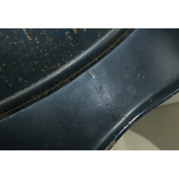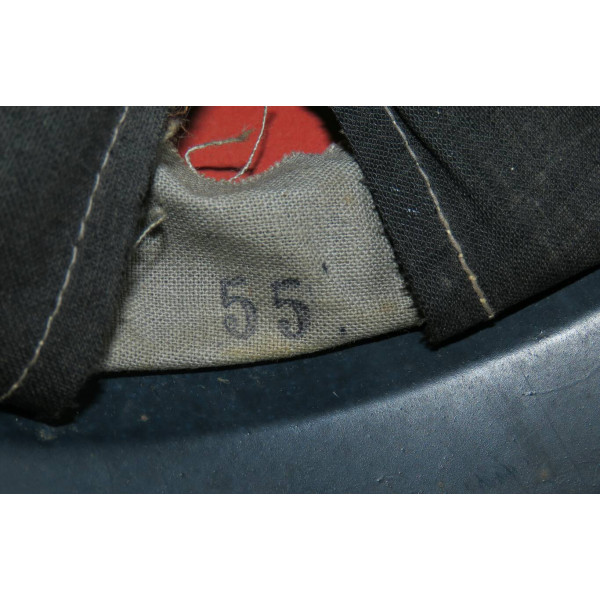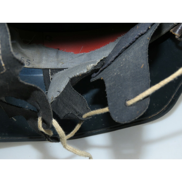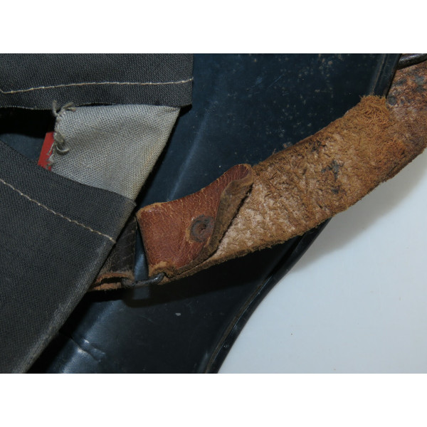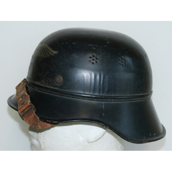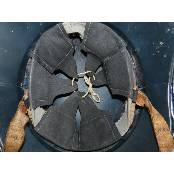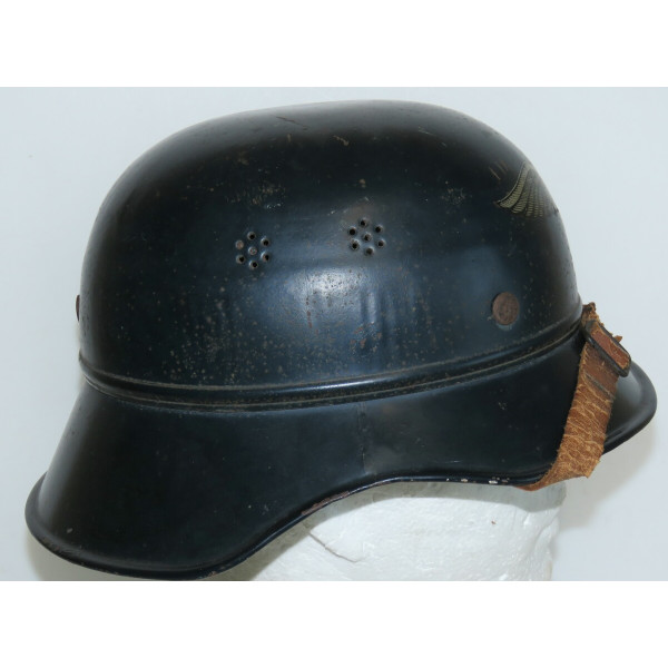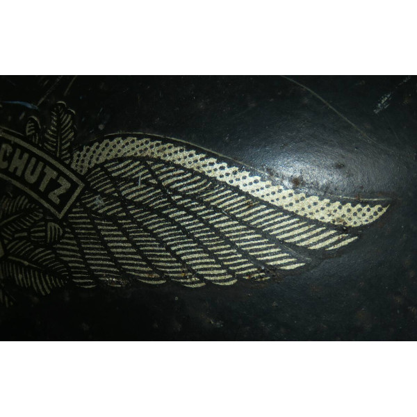 Complete Luftschutz civil defense helmet with original dark blue paint and preserved “Luftschutz” decal featuring eagle and swastika. Shows authentic traces of age and wear from use. The leather chinstrap is cracked from age but remains supple and fully functional. Excellent collectible condition.