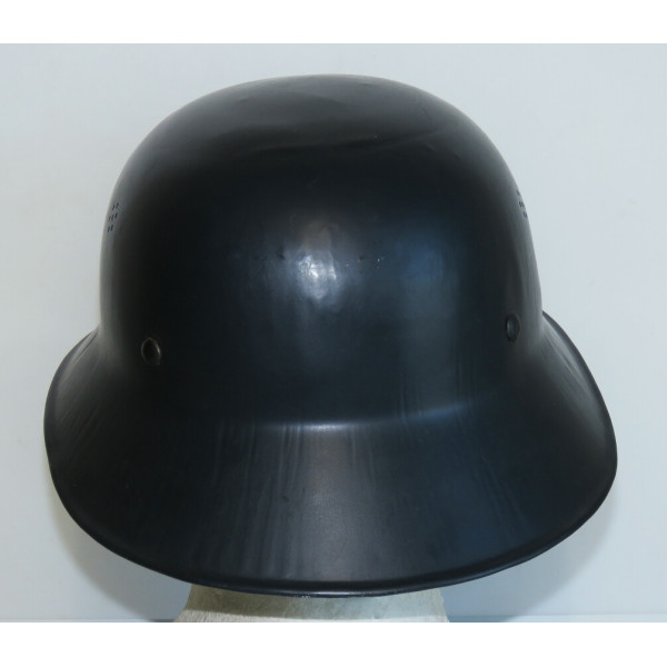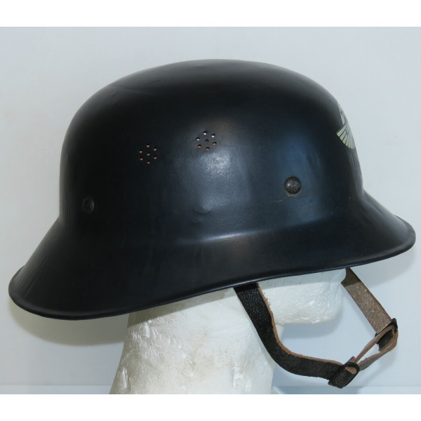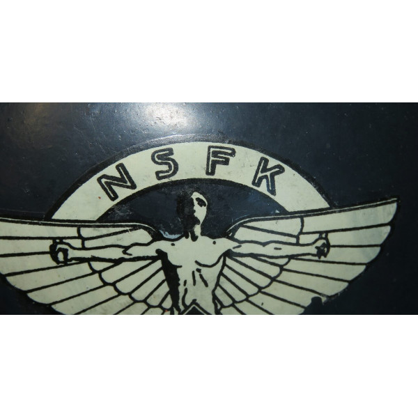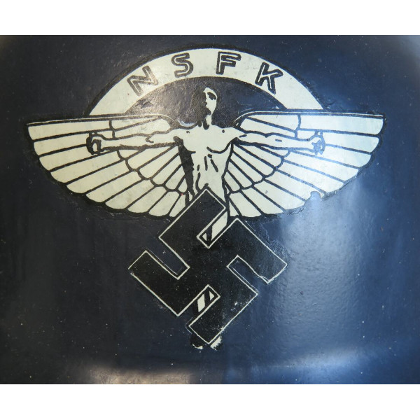 Civil defense helmet of the Luftschutz, gladiator type, final production pattern, made by one-piece stamping with a characteristic flat rim. It was used by the National Socialist Flyers Corps (NSFK) and bears on the front a decal depicting Icarus with outstretched wings, holding a ribbon inscribed with "NSFK" and a swastika at his feet. Rare combination of late war Luftschutz helmet and NSFK decal.