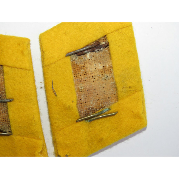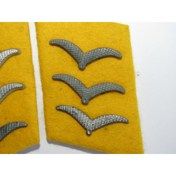 Matched pair of Luftwaffe collar tabs for an Obergefreiter or Feldwebel of flying personnel or paratroopers. Made of yellow felt with affixed metal rank devices ("gulls") denoting the wearer’s rank. The set is in absolutely outstanding condition, showing no signs of wear or use whatsoever