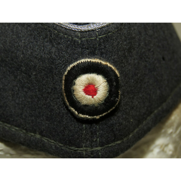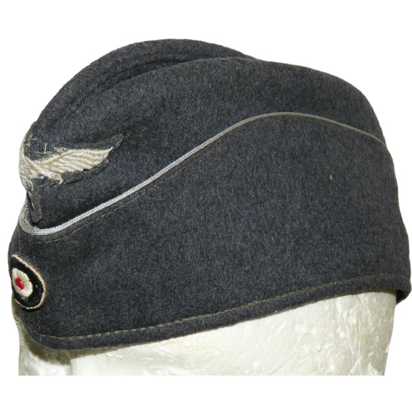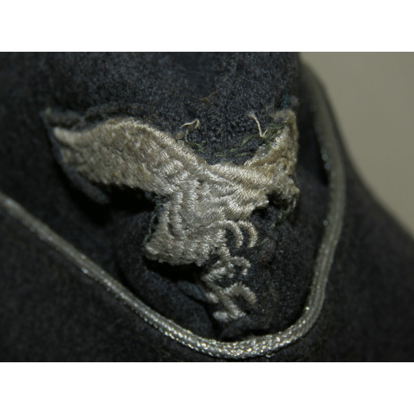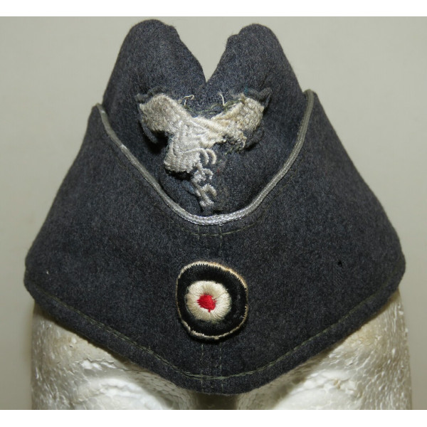 Late-war Luftwaffe officer side cap of private, tailor-made production. A notable feature is the use of insignia typically associated with enlisted ranks, making this headgear an unusual example for officer wear.