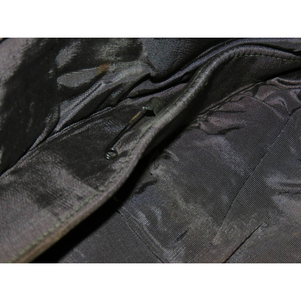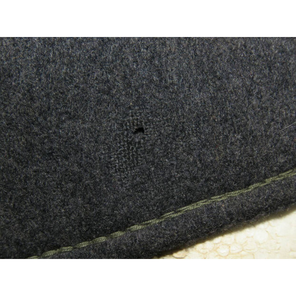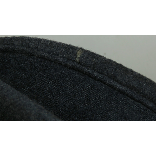 The eagle is machine-embroidered using non-shiny thread. It is proportionally larger than standard cap eagles, yet smaller than the external tunic eagle. The embroidery shows moth damage. The cap itself displays several small moth holes that do not significantly affect its overall appearance, as well as a moth-damaged area along the edge of the cap.