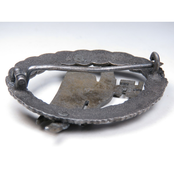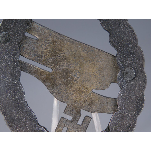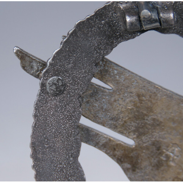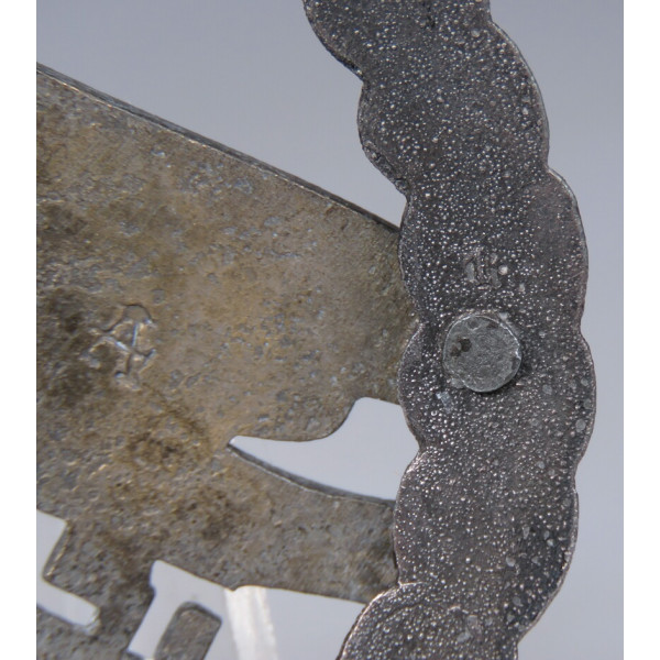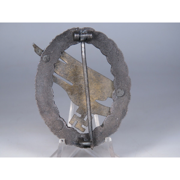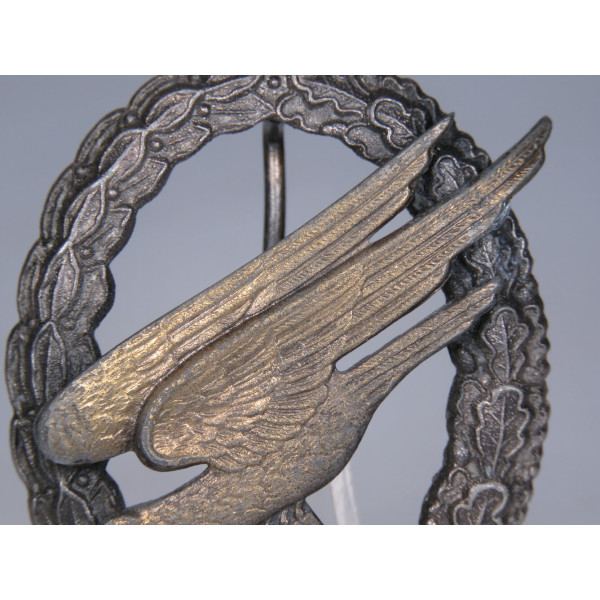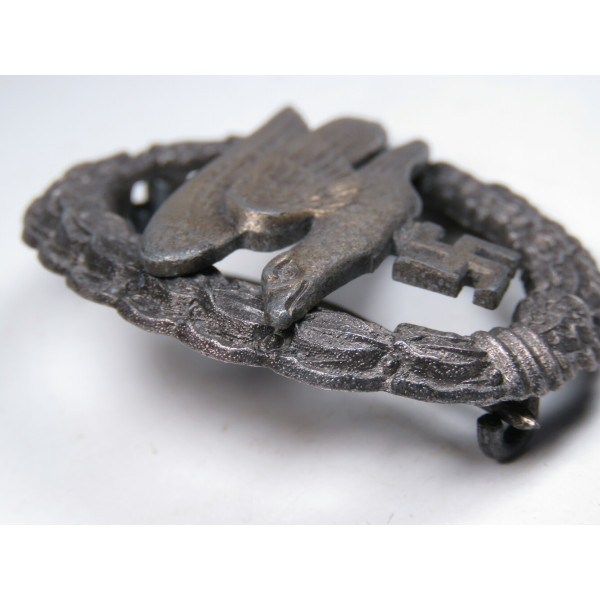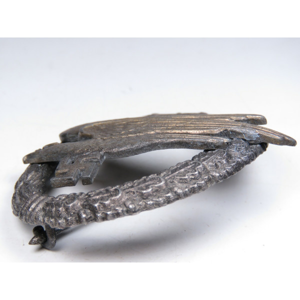 Fallschirmschützenabzeichen manufactured by Assmann & Söhne, maker’s A logo on the reverse of the eagle. Zinc, late-war finish; retains original gilt eagle and dark wreath. Excellent condition with no wear; crisp detail and clean factory hardware. Near mint